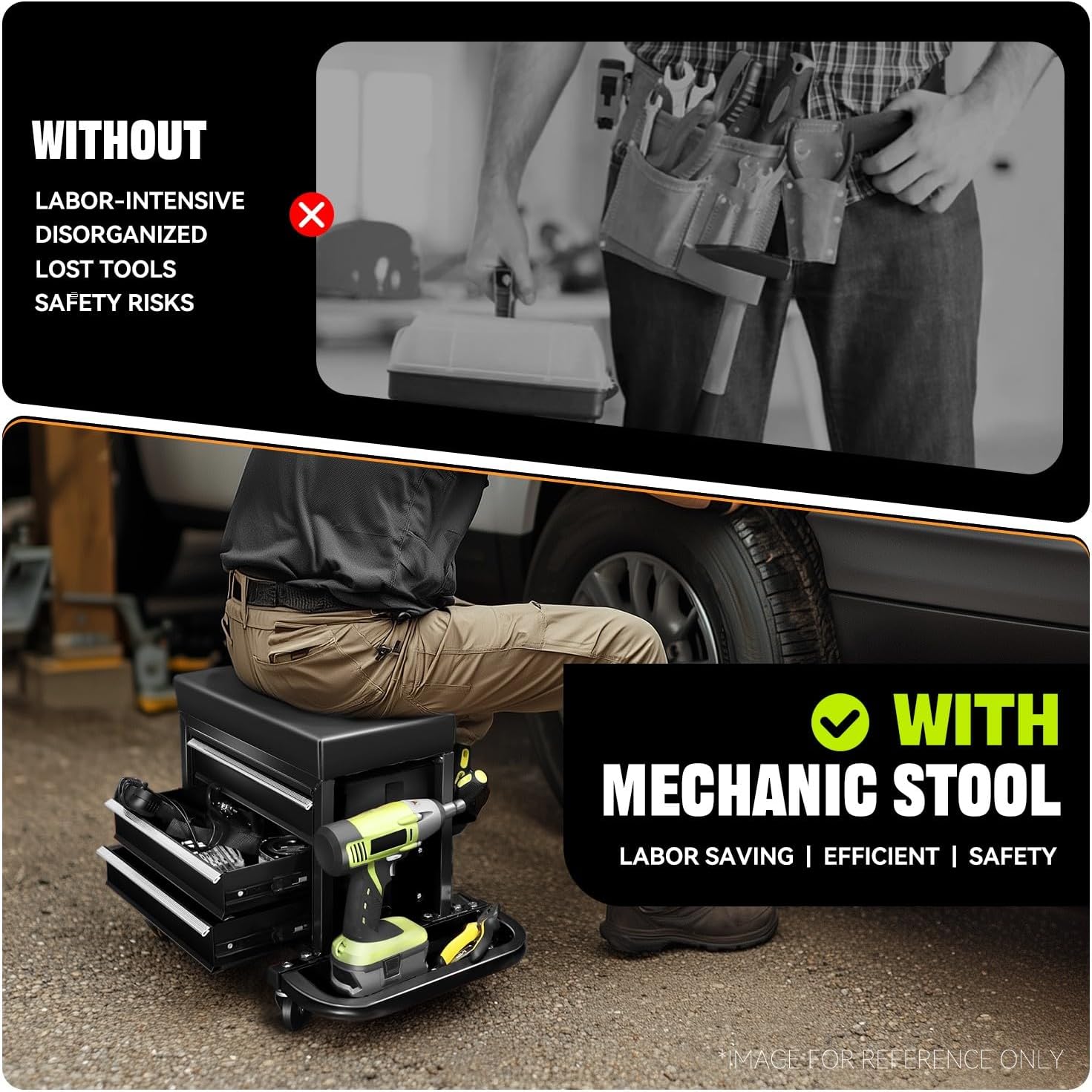 - 360-Degree Swivel Casters: Our tool chest seat features 4 x 2.5-inch swivel casters, allowing for smooth maneuvering in your garage, reducing the time spent moving around, letting you focus on the job at hand