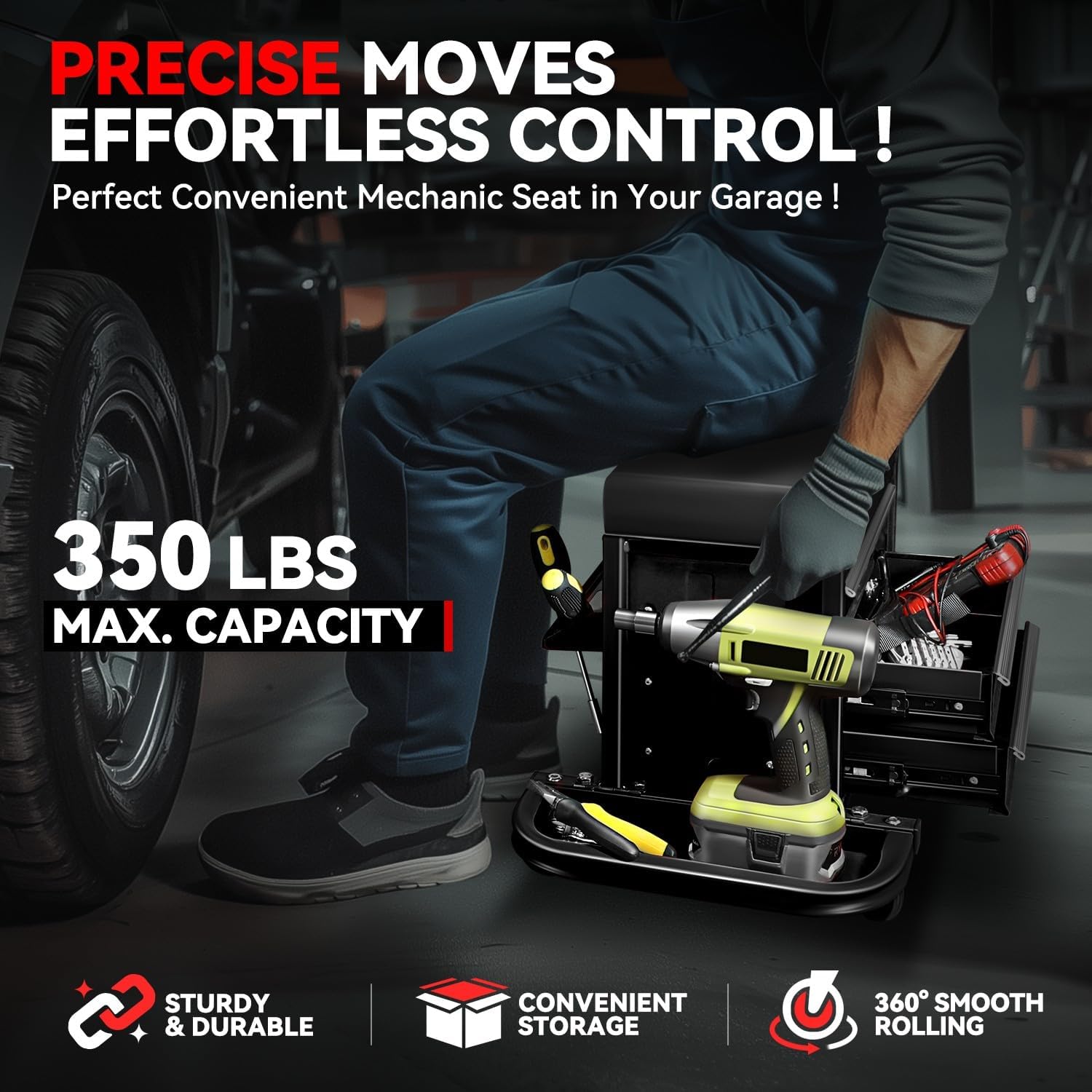 - Convenient Storage: This rolling seat has 3 drawers and 2 fold-down side trays, which offer ample storage for small tools and parts. Keep your car care and repair essentials close at hand, allowing you to work more efficiently.