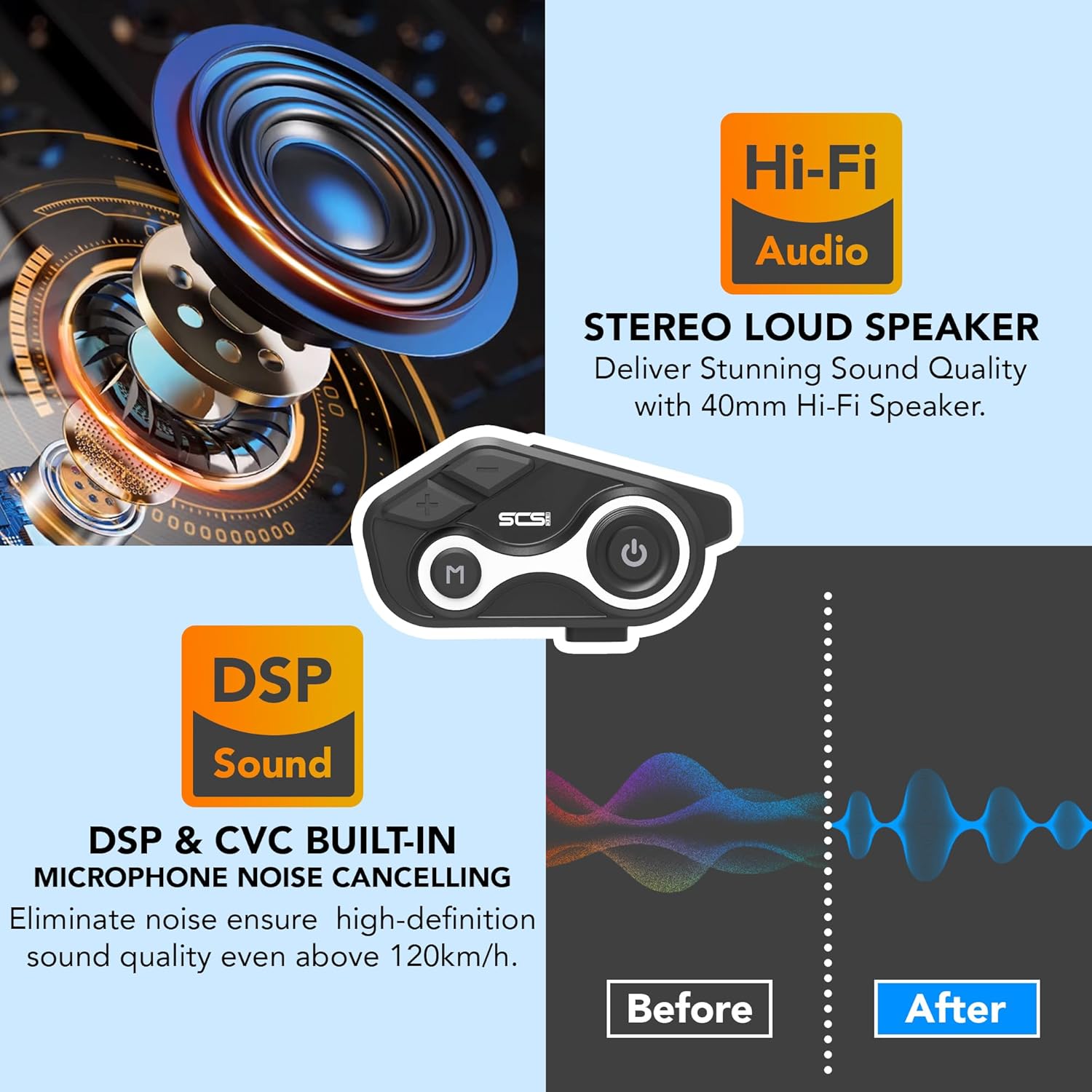 - Crystal-Clear Sound Quality: This helmet headset intercom uses high sound quality full-range membrane monomer. S-8X built in CSR's CVC tech achieve up to 30DB noise control via high-power & high-definition headphone and pro wind-noise-proof mic. Focus on echo generated on call to suppress reverberation noise, effectively reduce background noise.