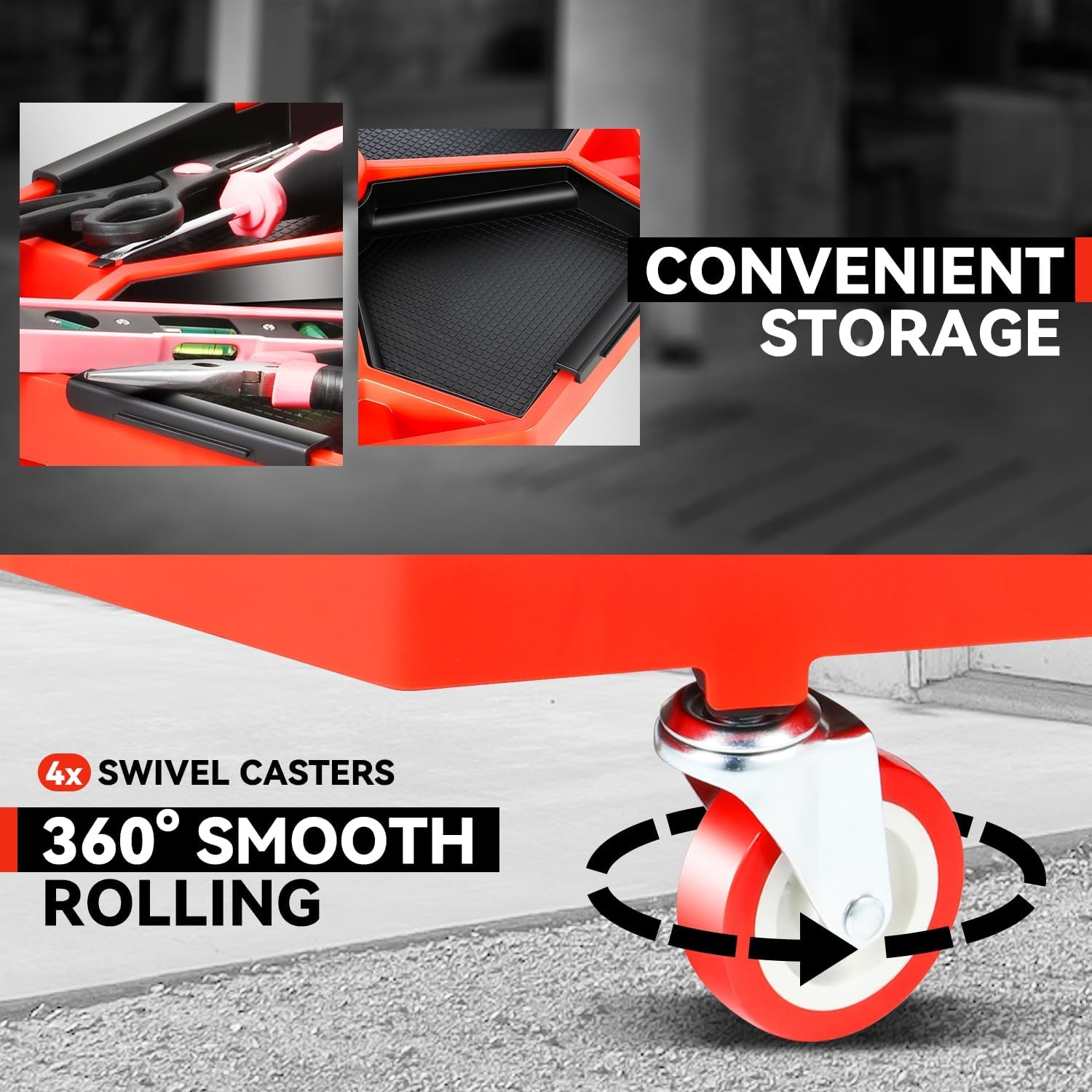 - 【Enhanced Mobility】Equipped with 4 swivel casters, this mechanic stool provides smooth and precise maneuverability around your garage, streamlining your work process.