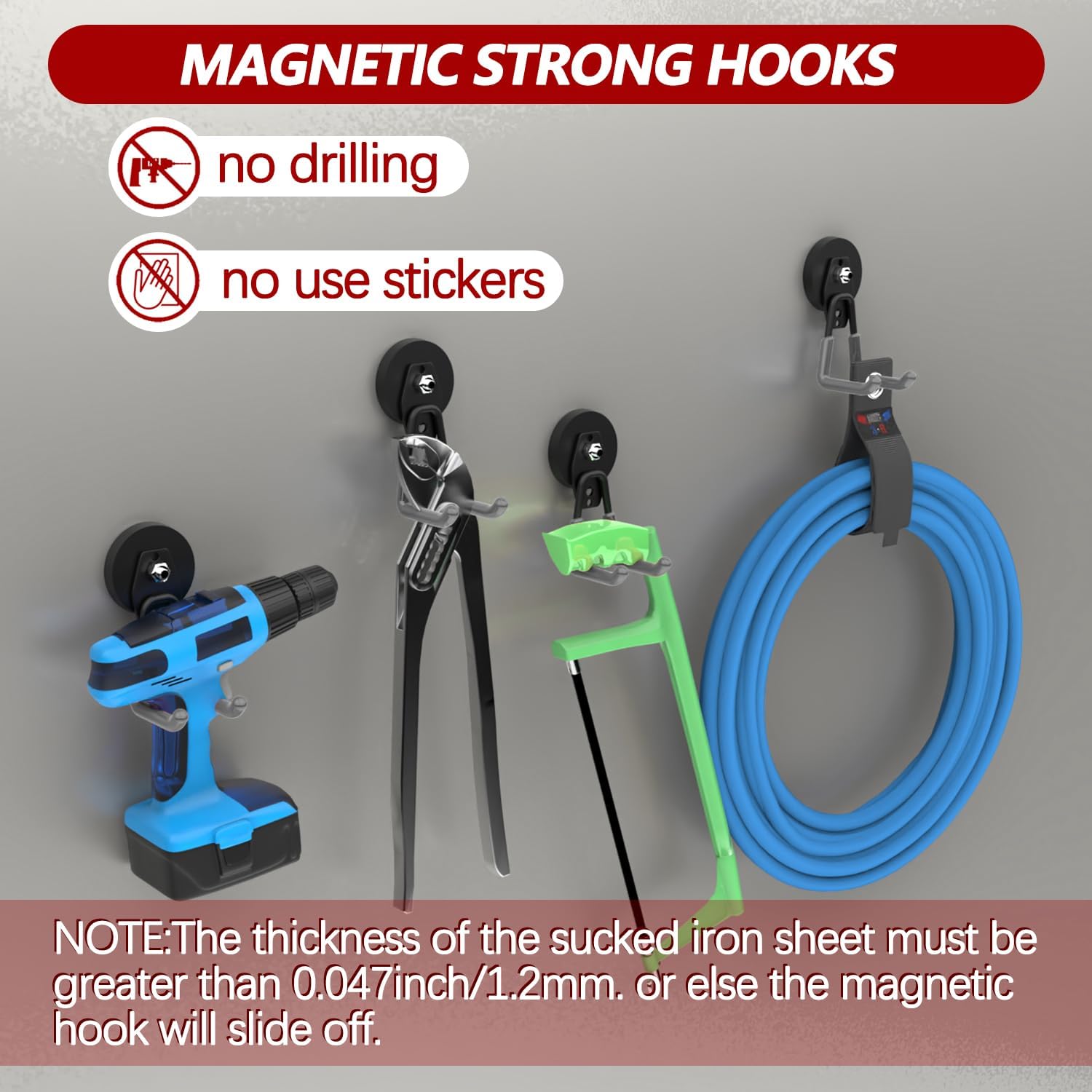 - Innovative No-Drill Magnetic Hooks: Eliminate the need to punch holes and effortlessly adhere magnet hooks to any metal surface, you can move them around as your needs change. The large magnetic hook has a dual-hook design for versatile use and can be separated into magnet and hook components. Our magnets with garage hooks heavy duty are coated with non-slip PVC and has protective sleeves to prevent scratches and rust