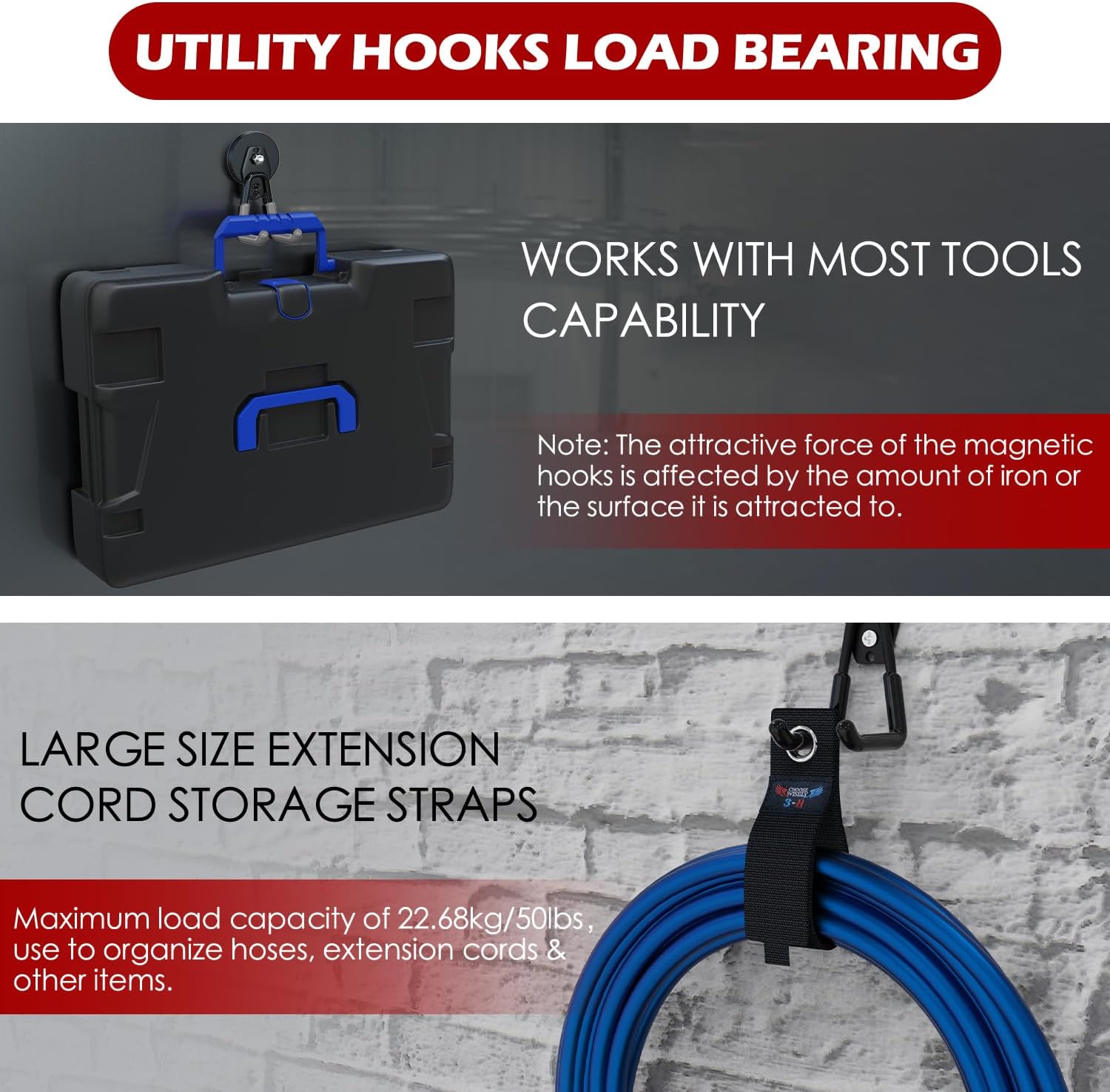 - Extremely Strong Magnetic: The magnet features a soft, high-friction rubber exterior and 6 powerful internal magnets for enhanced adhesion. The heavy-duty magnetic hooks, with their upgraded magnetic force, now offer even greater load capacity in both horizontal and vertical orientations.Note: The thickness of the adsorption iron sheet must be greater than 0.047inch/1.2mm, otherwise the magnetic hook will slip off