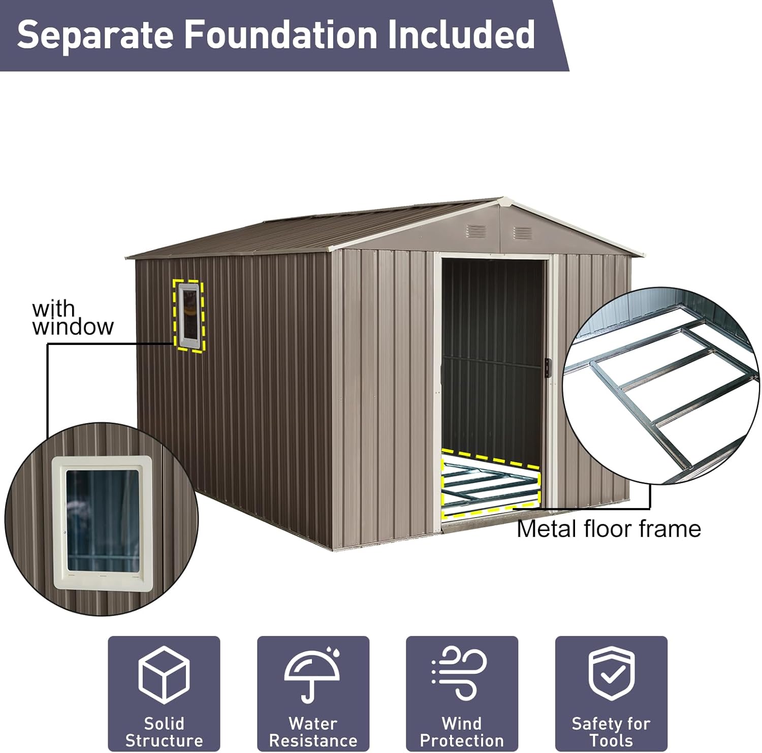 - [Robust Construction] Featuring unique aluminum frames and galvanized steel panels, this metal shed is built for durability and strength. The eco-friendly coating ensures it withstands harsh weather conditions for at least 6 years, making it a reliable outdoor storage shed.