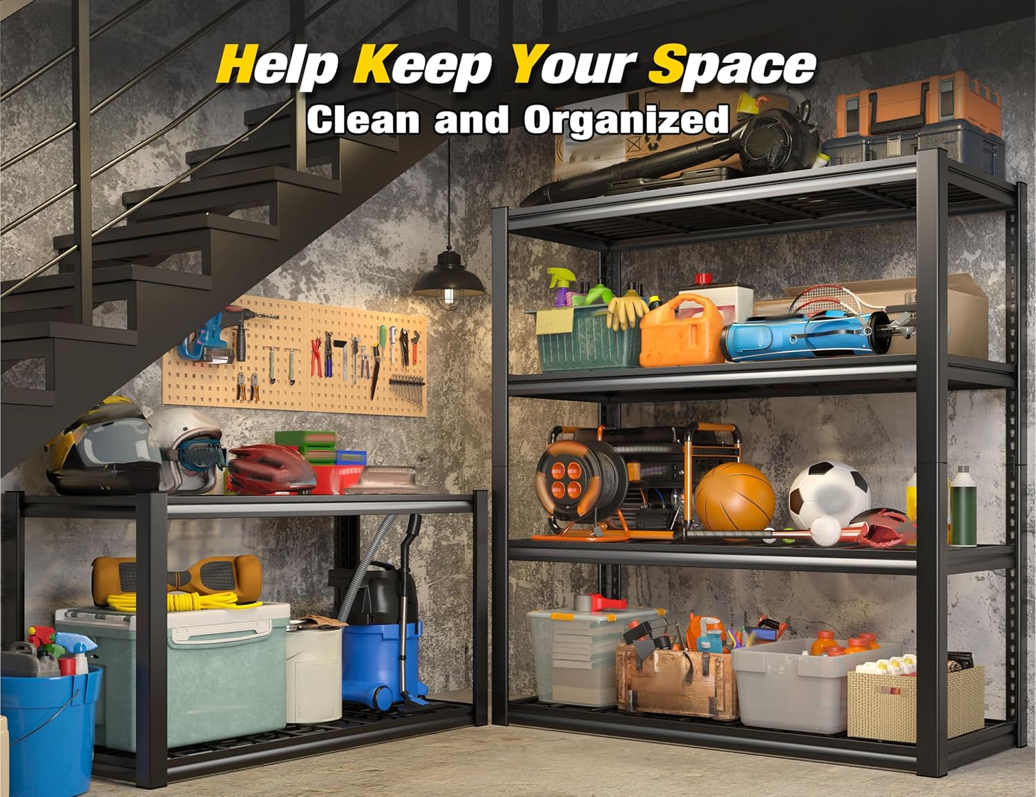 - 【Adjustable and Dividable Design of Garage Shelving Unit】Adjust the height of all four metal storage shelves according to your own needs, this garage storage racks could also be divided into two individual shelves, use one for storage and another as work bench. Additional foot pads are included to protect your floor after divided