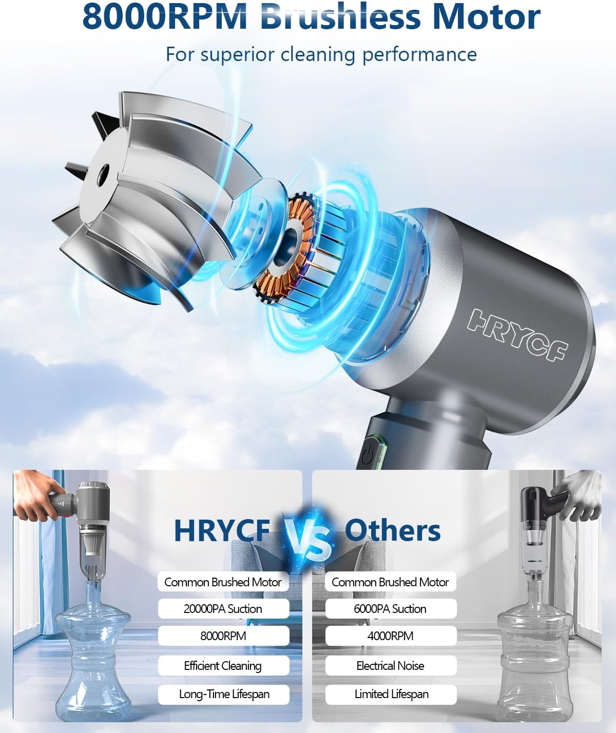 - 【Brushless Motor & 20,000Pa High Power】The rechargeable car vacuum features cutting-edge brushless motor technology, reaching up to 80,000RPM and delivering 20,000PA of suction power. Compared to traditional motors, the brushless design offers stronger suction, enhanced performance, and a longer lifespan