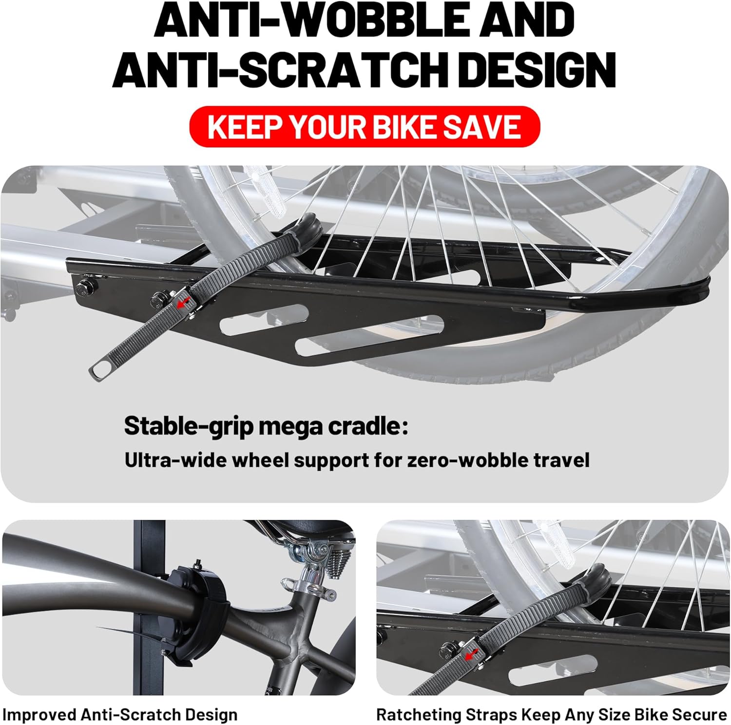 - 200 LB TOTAL CAPACITY: Built for durability and strength, this bike rack boasts an impressive 200lbs capacity, securely accommodating heavier electric bikes or multiple conventional bicycles with ease. Trust in its robust construction for reliable, strain-free transportation.