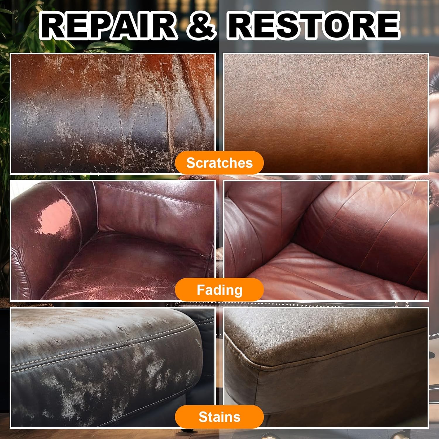 - Leather sofa repair kit for couches - Using our leather color restorer for furniture to rescue your vinyl and leather items from their worn-out condition. This leather repair cream works best in recoloring arm rests and leather upholstery to protect them from recoloring, deformity, and unappealing scratches.