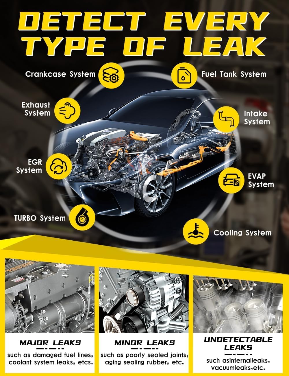 - Multifunction: Our automotive smoke machine can do various tests like EVAP, car sealing, fuel tank, exhaust, intake system and pipe fittings tests. It's applicable to cars, motorcycles, snowmobiles, ATVs, light trucks and boats