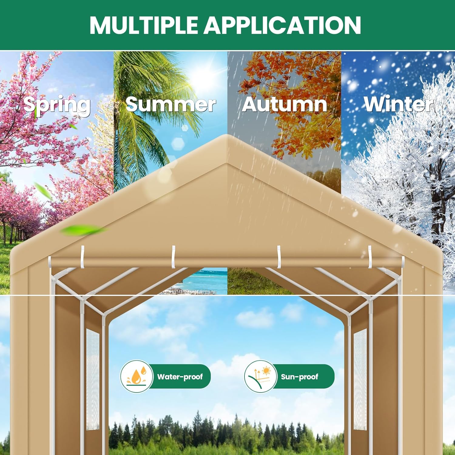 - 【Built to Last】 Constructed from 180g PE tarpaulin, the carport canopy withstands sun, rain, and dust year-round, providing full protection for your car or boat. It is securely attached to the frame with bouncy balls, stable support feet, ground nails, and wind ropes, ensuring durability in all seasons.