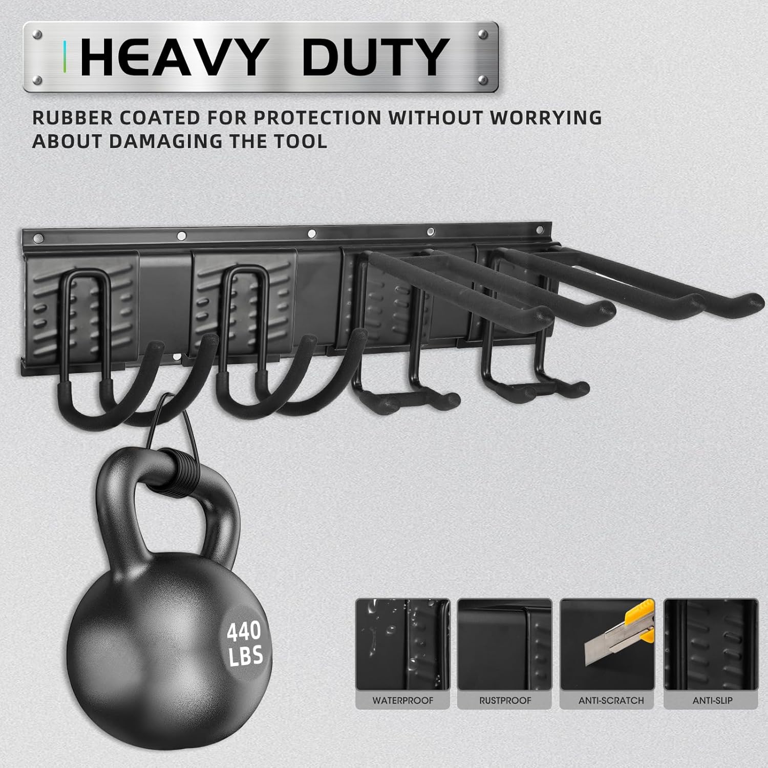 - Durable Rails and Rubber-Coated Hooks - This garage tool organizer wall mount includes 6 hooks, each 10 inches long. The hooks are covered in rubber to keep your tools from sliding and scratching. The tough construction ensures that it can withstand frequent use and the weight of your tools while remaining long-lasting and durable.