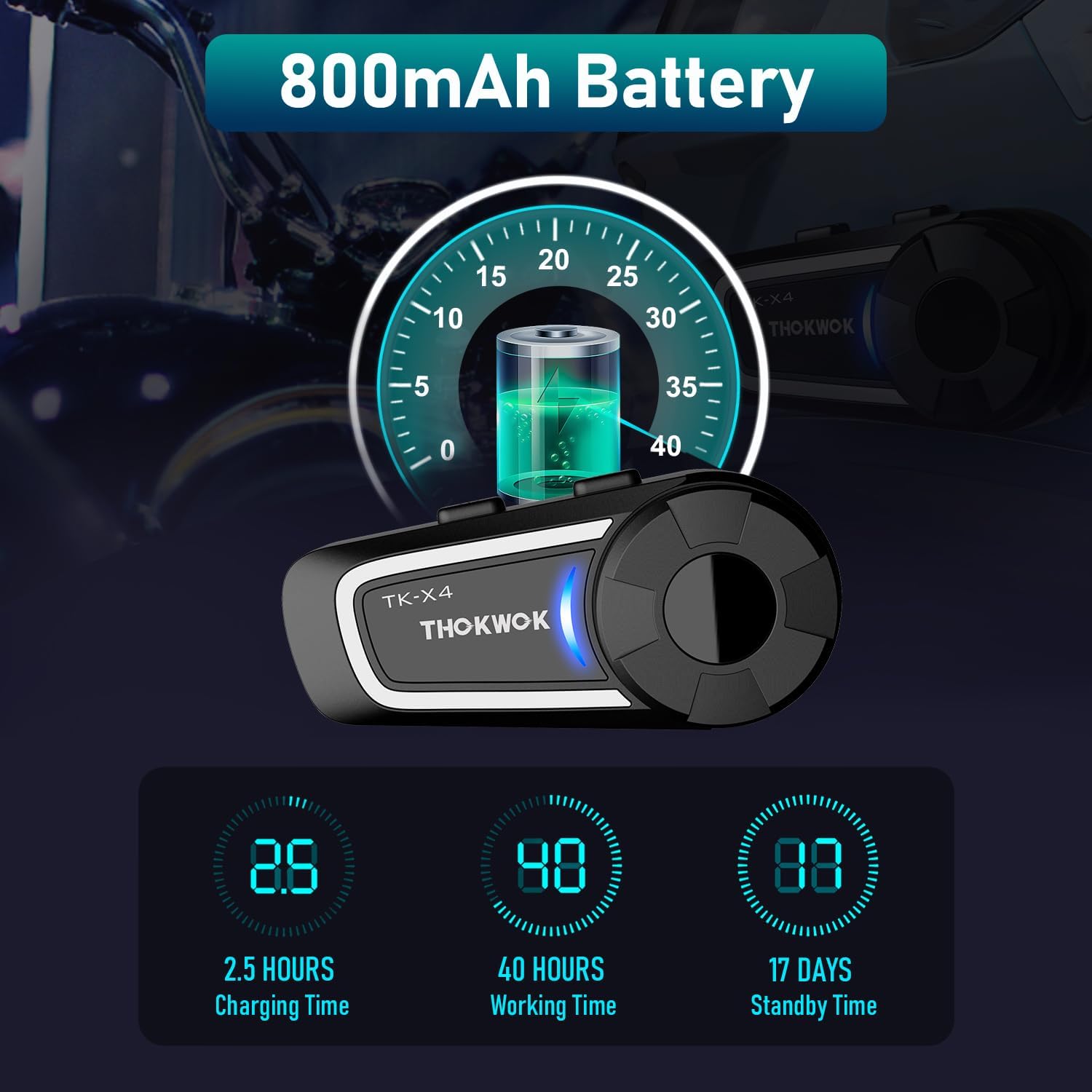 - 【6-Person Group Intercom & Music Sharing】TK-X4 motorcycle Bluetooth headset can connect up to 6 TK-X4 or X4SC units(Optimal for 4 units) and their communication distance is up to 2 kilometers, keeping you connected with your group during your motorcycle ride. The maximum communication distance is 800 m in two-way intercom. It also featured music sharing, allowing two riders to enjoy the same song simultaneously during their journey.