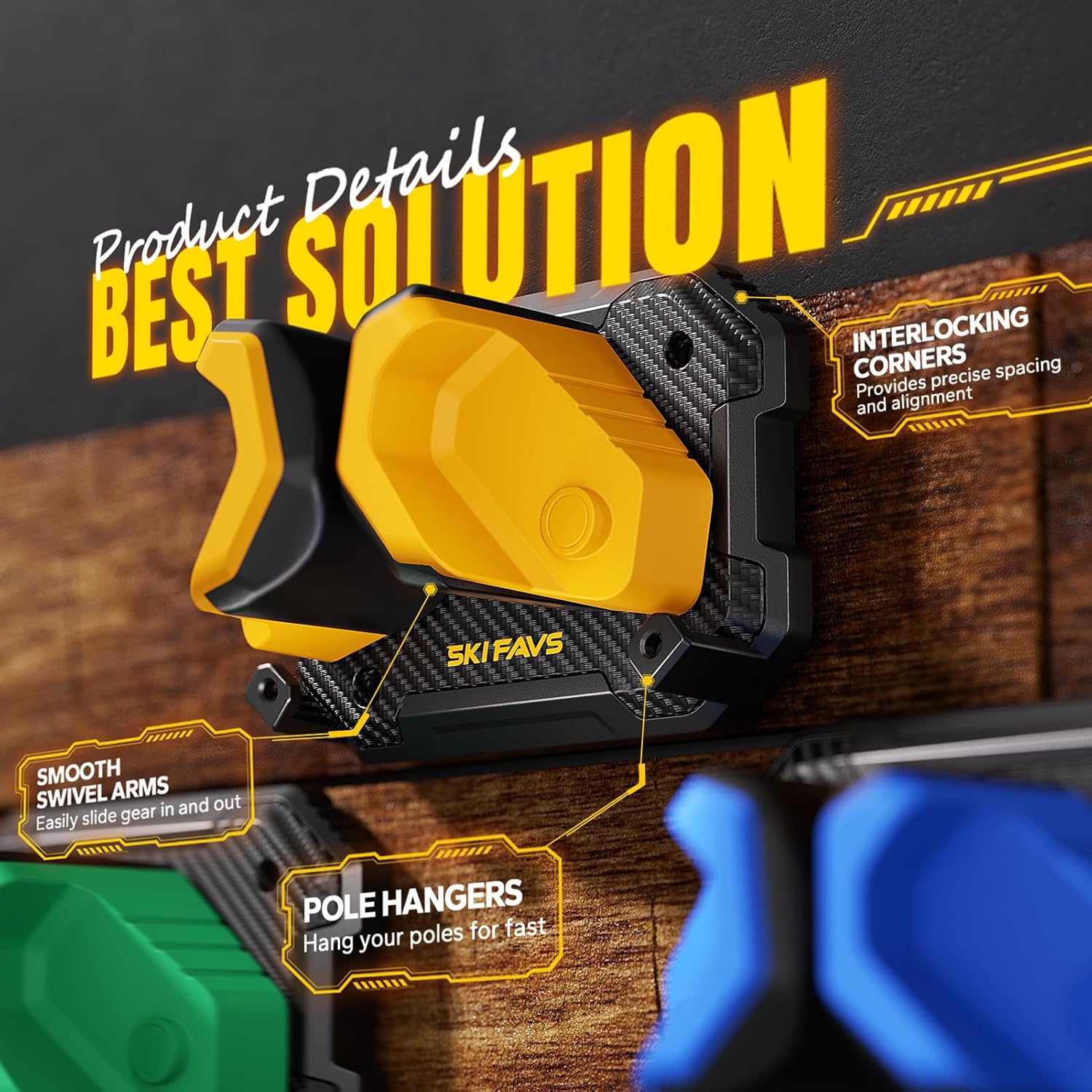 - Time-Saving Convenience, Easy in and out: Smooth swivel arms allow quickly take out & put down the skis, grab-n-go. Just push up to open and automatic locking. Saving you valuable time that can be spent on the slopes. No more fumbling or searching for your skis amidst a heap of equipment. Installing is as simple as using it. All ski wall mounts come with 5 pre-drilled screw holes and drywall screws. All you need to do is measure and mark the location for installation.