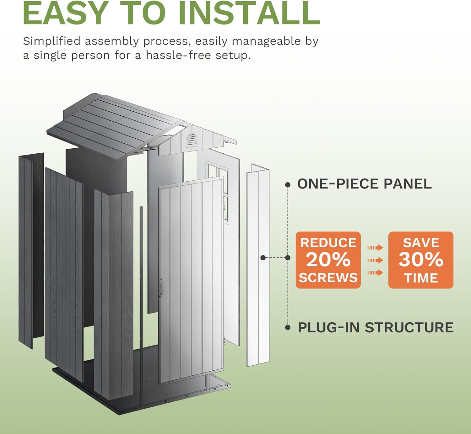 - Easy Installation: Creative designed One-Piece Panel Plug-In Construction reduces screws by 20%, which directly saves 30% of installation time, allowing you to assemble our sheds conveniently with just ONE PERSON.
