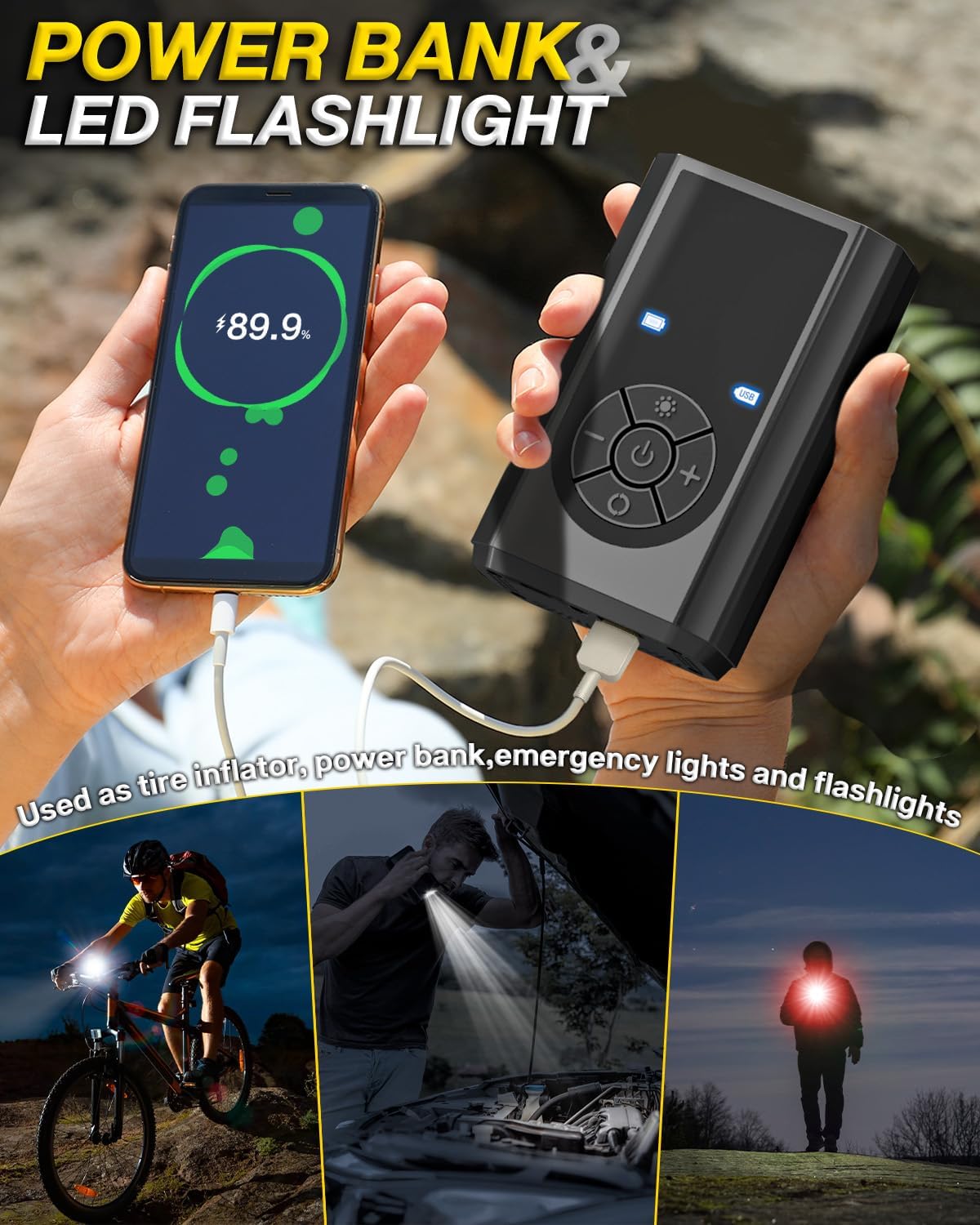 - Versatile Compatibility: The air pump comes with multiple adapters to accommodate various tire types and inflation needs, including cars, motorcycles, bicycles, and sports equipment.