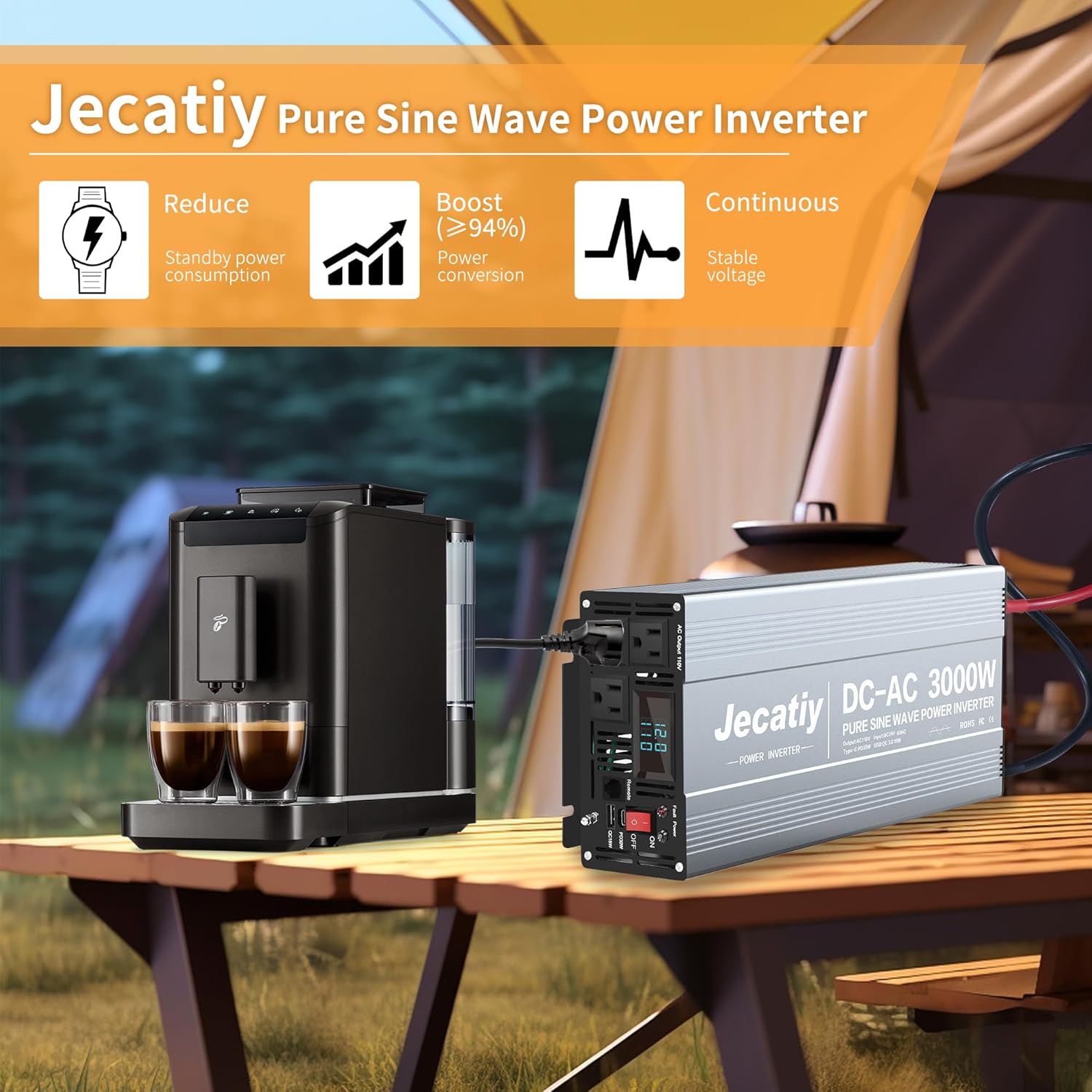- 【High Conversion Efficiency】Advanced pure sine technology with high-quality AC equal to mains power, which is the same power used by household appliances, has up to 94% conversion efficiency, and greatly reduces conversion consumption. The Jecatiy power inverter is efficient and safe