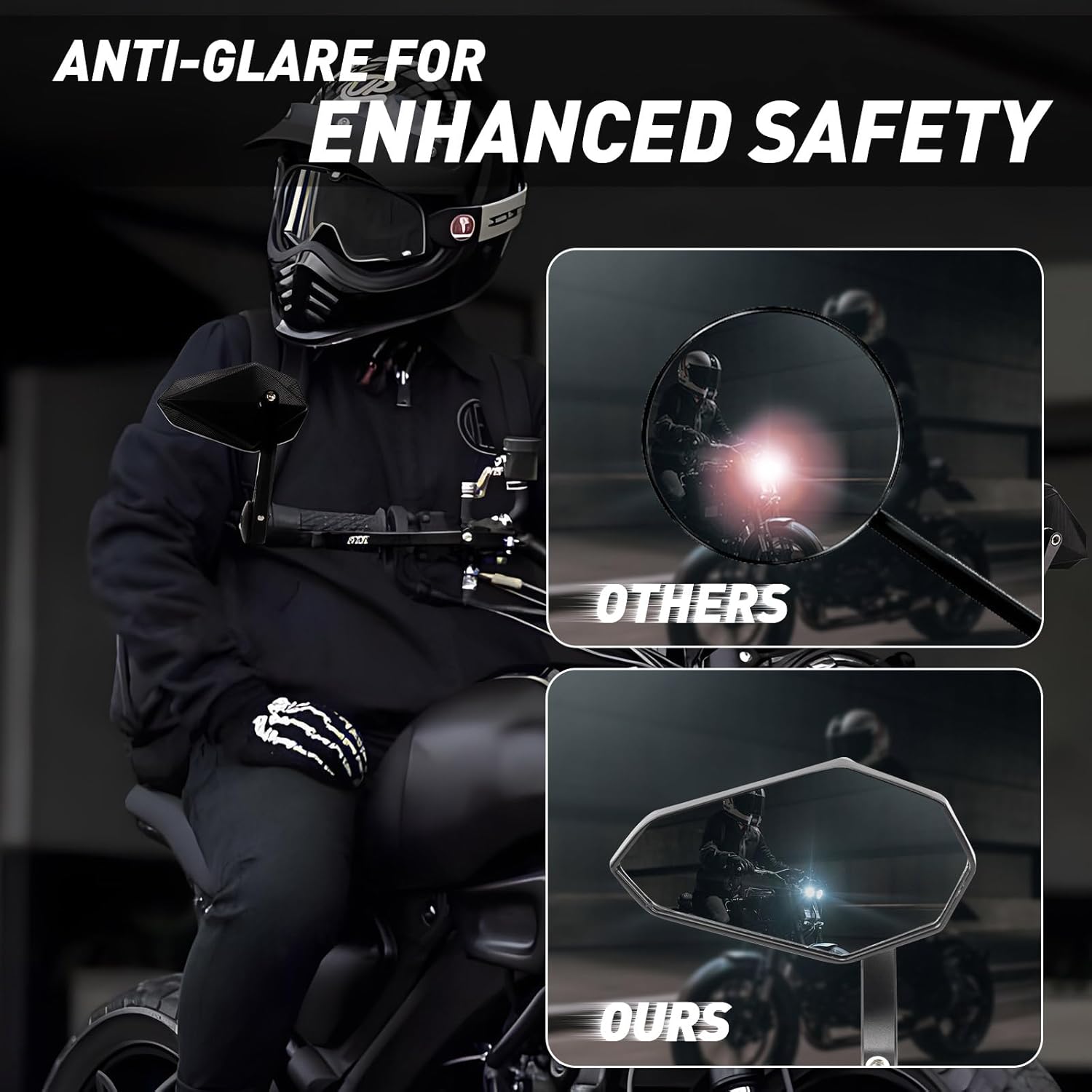- Clear & Wide Rearview Vision – Our Motorcycle Handlebar Bar End Mirror features a high-definition convex glass lens, providing a wider field of view to reduce blind spots and improve safety. The anti-glare coating enhances visibility in various lighting conditions, ensuring a clear and distortion-free rearview while riding.
