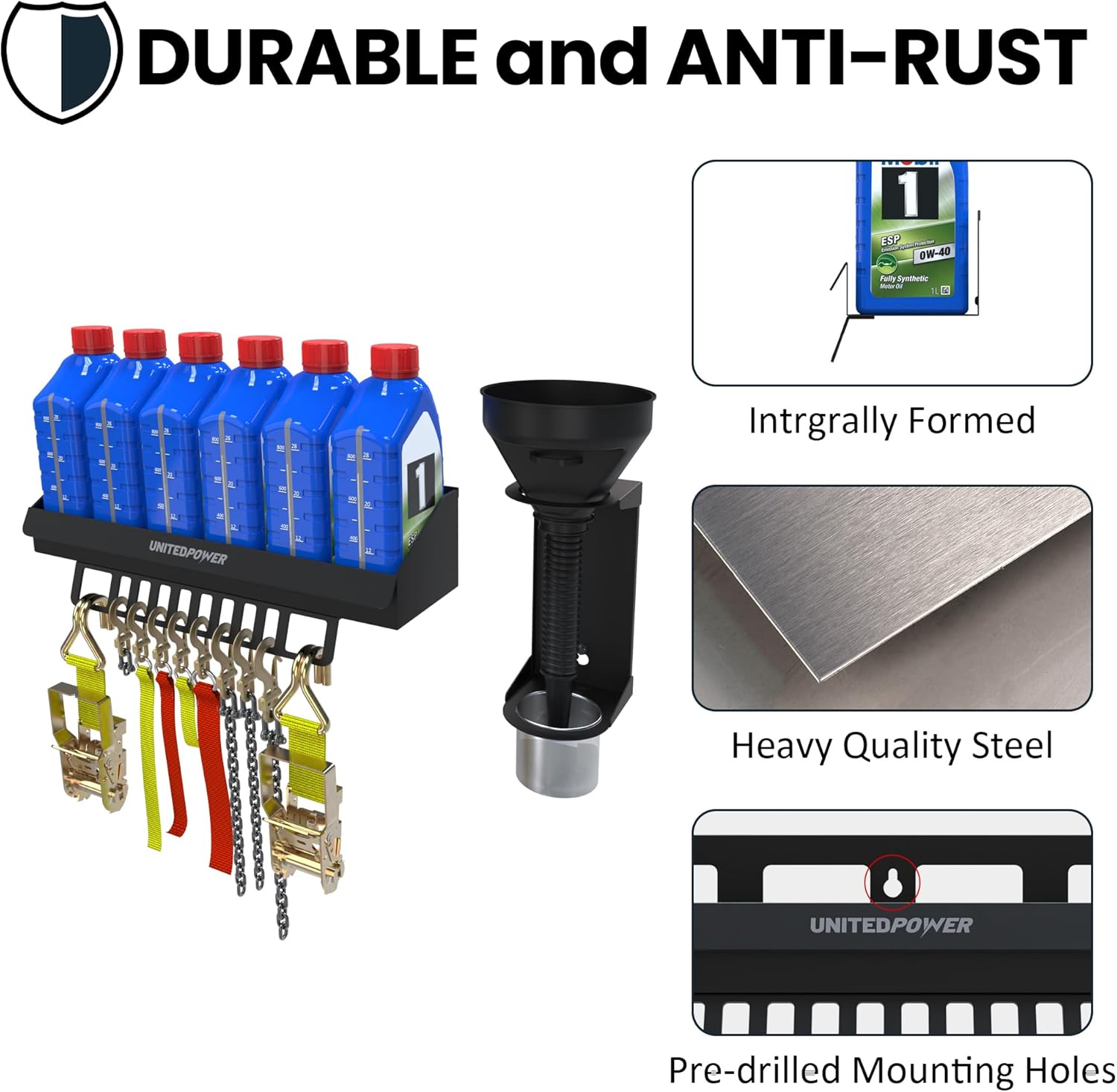 UNITEDPOWER 6 Quart Motor Oil Storage Rack, Bottle Shelf Mount Caddy With Funnel, Enclosed Race Trailer Shop Garage Organizer