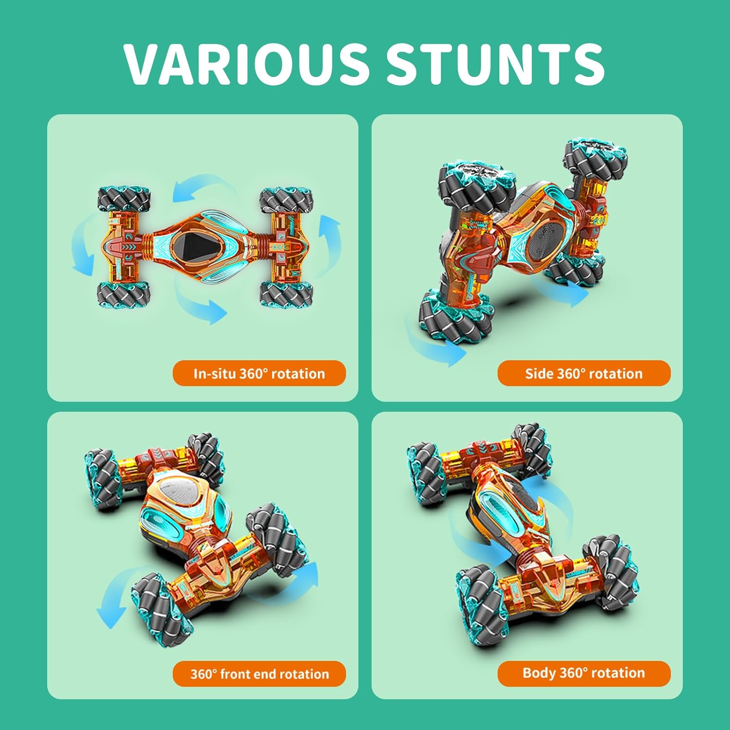 - All-Round Drift & Cool Stunt:4WD High-Tech gesture sensing rc stunt car can drive and drift in all directions, 360° rotation, 45° climbing, double-sided body flip, Double-sided Driving can easily pass obstacles,Cool functions and unlimited fun give children wonderful operation experience and visual effects.
