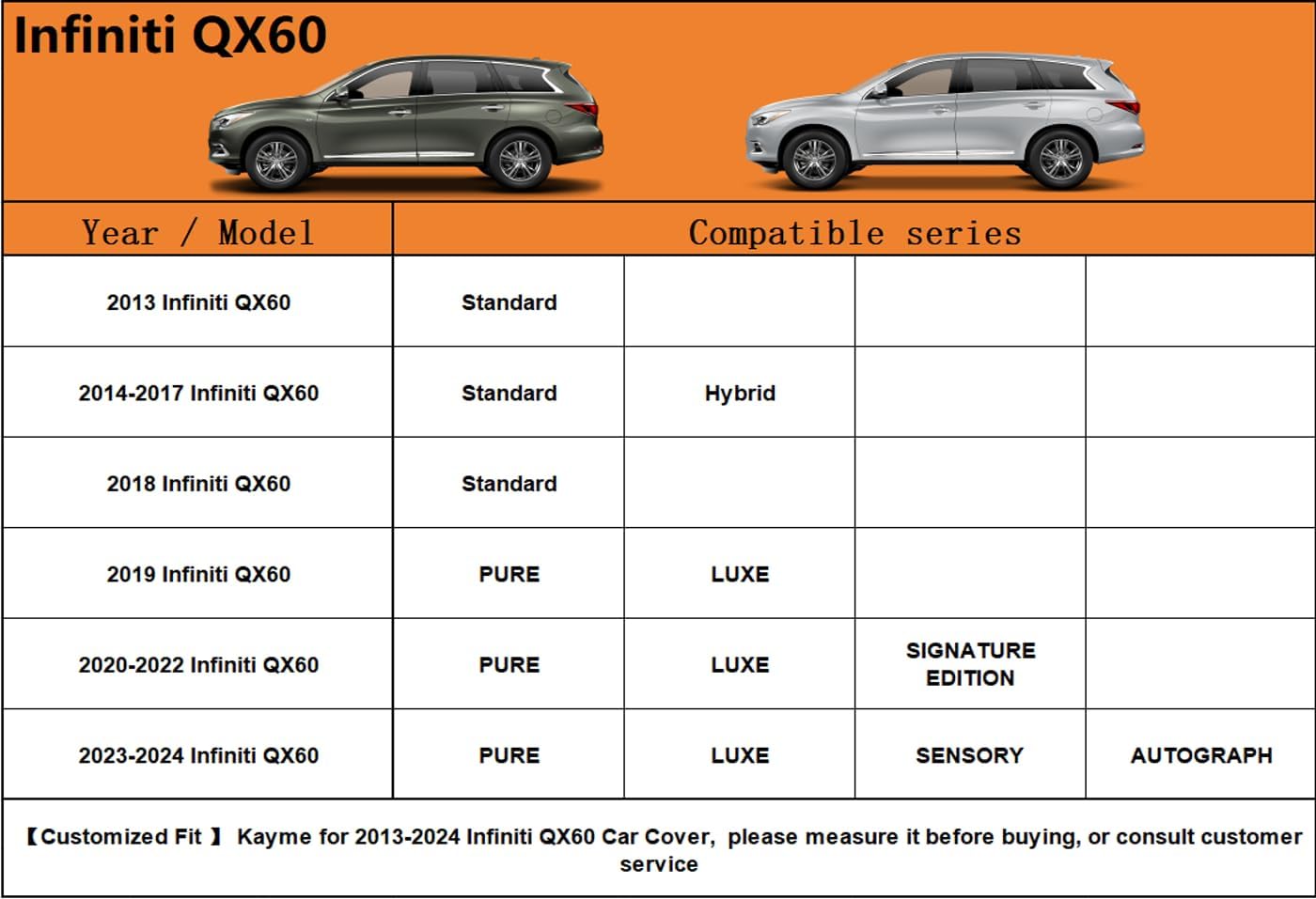 - Coverage : Full exterior coverage for Infiniti QX60 SUV (2013-2024)