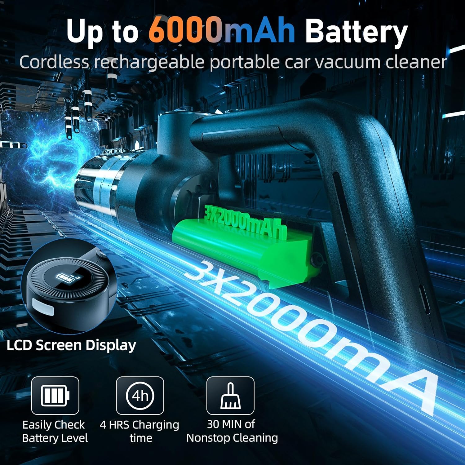 - 【Rechargeable and Portable】This mini vacuum cleaner is equipped with a 𝟔𝟎𝟎𝟎 𝐦𝐀𝐡 battery, which can run continuously for up to 𝟑𝟎𝐦𝐢𝐧 after charging 𝟒𝐡. It comes with a Type-C charging cable, which can be charged in the car or anywhere with a USB slot at home. The cordless design is convenient for use and storage at any time, and comes with a storage bag to keep all accessories together.