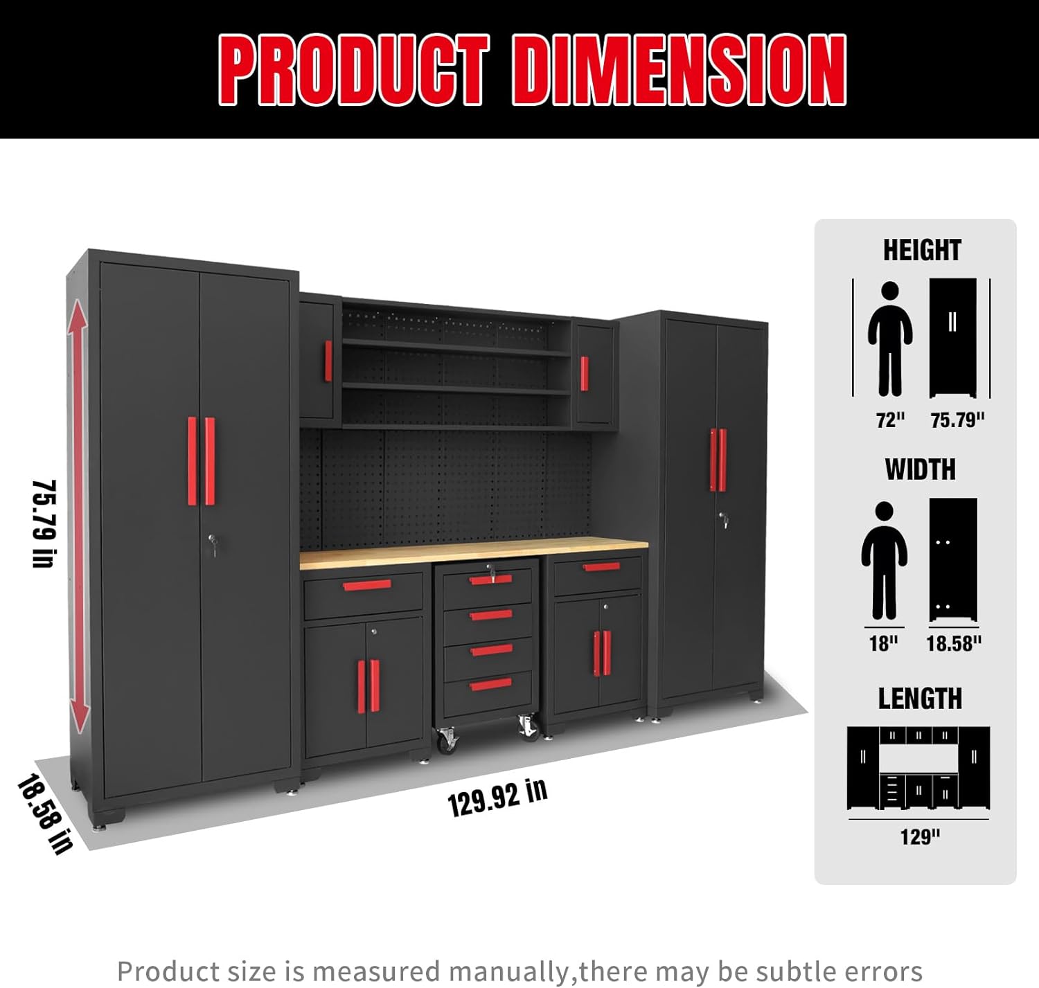 - Dimensions: The size of garage storage cabinet set is 130"L x 19"D x 76"H. Garage storage cabinets system includes locker x2, wall cabinet x2, 1-drawer roller cabinet x2, 4-drawer roller cabinet x1, 71" workbench x1, pegboard x10 and shelving to connect the wall cabinets x4. For stability, high cabinets can optionally be fixed to the wall. Overall weight capability 820LBS.