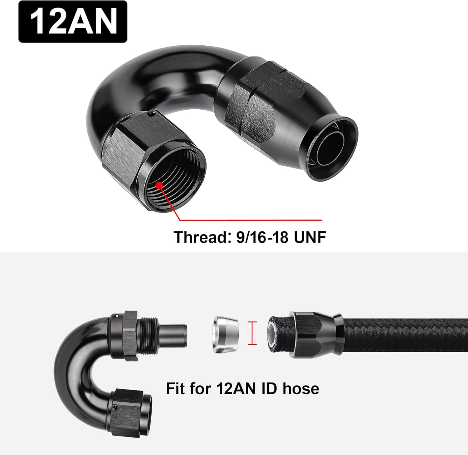 - [Product Size & Parameter] Size: 12AN. Thread Size: 11/16-12 UNF. Working Pressure: 1500PSI. Working Temperature Range: -40°F-250°F. Angle: 180 Degrees. Note: Please verify the hose size before purchase.