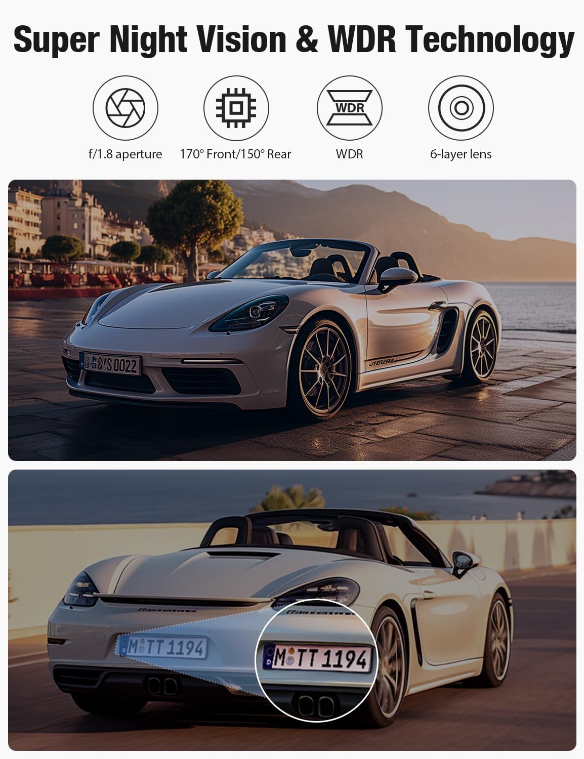 - 【Reliable Witness for Accident】G-sensor auto detect a collision and lock the file to prevent that from an overwrite; Built-in super capacitor (without battery), allow withstand extreme temperatures from -4°F to 158°F, the working temperature of dashcam is 30℃ to 50℃, so it is normal for your dash camera to run slightly hot; Must formate the SD card before first-time use, support max up to 256GB. Note: SD card not included, need to purchase separately(Asin: B0DPC9FFQ2)