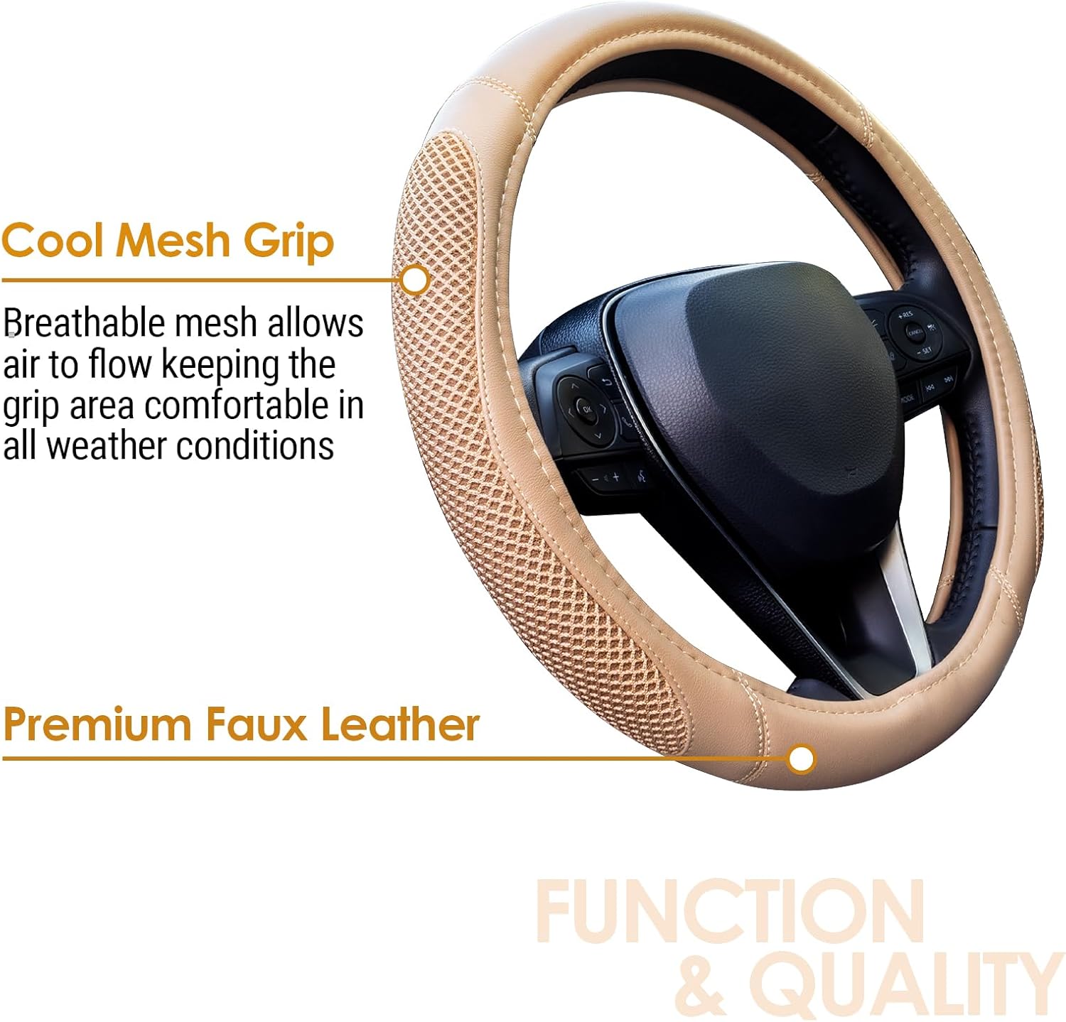 - COOL MESH GRIP - Our steering wheel cover is designed with a breathable mesh grip that allows air to flow keeping the grip area comfortable in all weather conditions