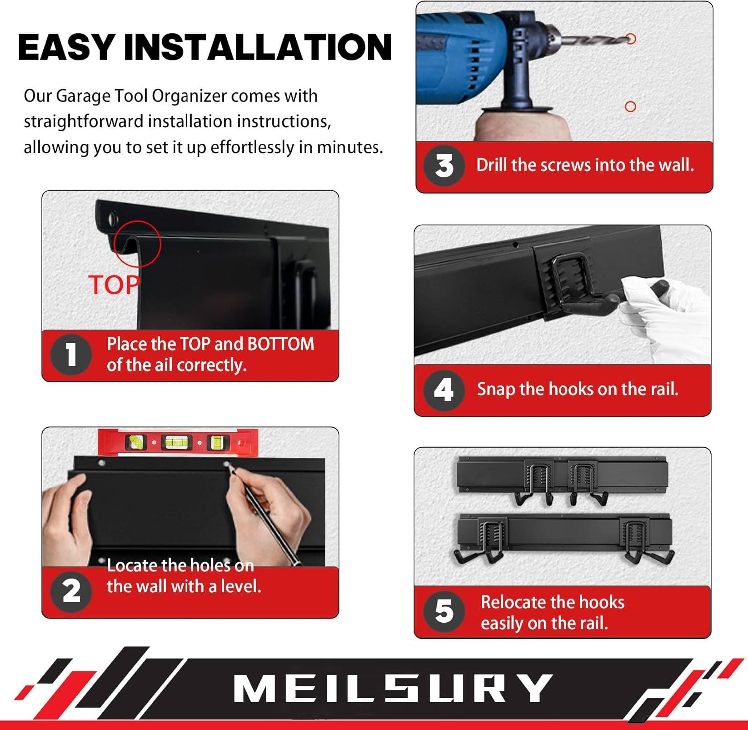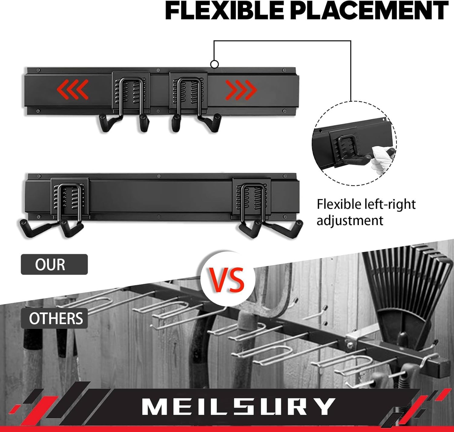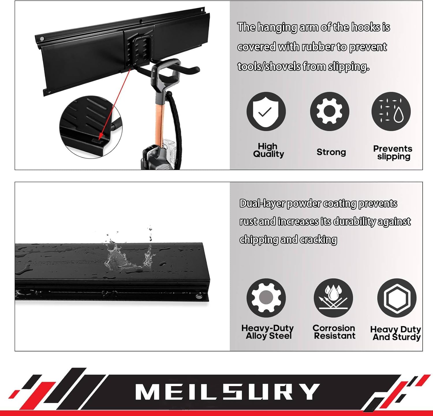 - Product Contains:Adjustable Garage Wall Mount Tool Rack with 7 hooks (2 tool hooks, 2 double hooks, and 3 single hooks) and 3 rails. It measures 48 inches in overall length and comes with a torpedo level for easy installation.