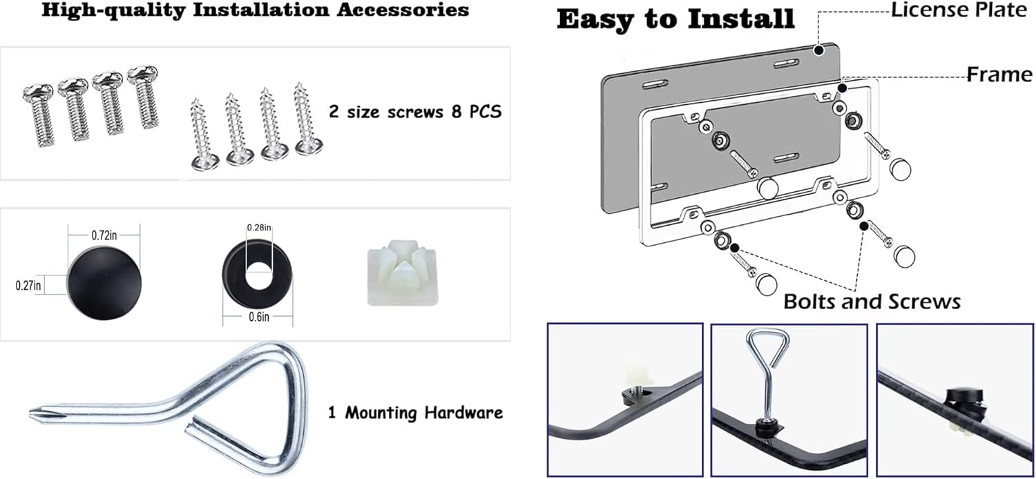 - What you will get: 2 license plate frame cover, 4 Screw Caps, 4 Self-tapping Screws, 4 Machine Screws, 4 Washers, 1 Screwdriver.All the necessary accessories provided for your installation.