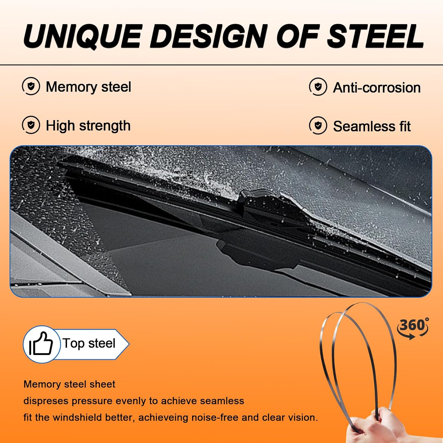 - 𝐑𝐄𝐋𝐈𝐀𝐁𝐋𝐄 𝐒𝐄𝐂𝐔𝐑𝐈𝐓𝐘: Windshield wipers have a specific beam curvature, ensuring a fit without noisy. Silicone wiper blades utilize dual precision-tuned steel springs to apply uniform pressure along the entire blade length, providing clear visibility in all weather conditions
