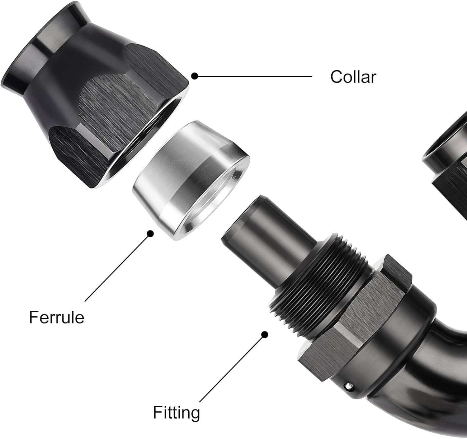 - [Built to Last] The one-piece PTFE hose end fitting is made from lightweight 6061-T6 aluminum alloy, and a black anodized finish on the surface increases durability, anti-corrosion, and wear resistance.