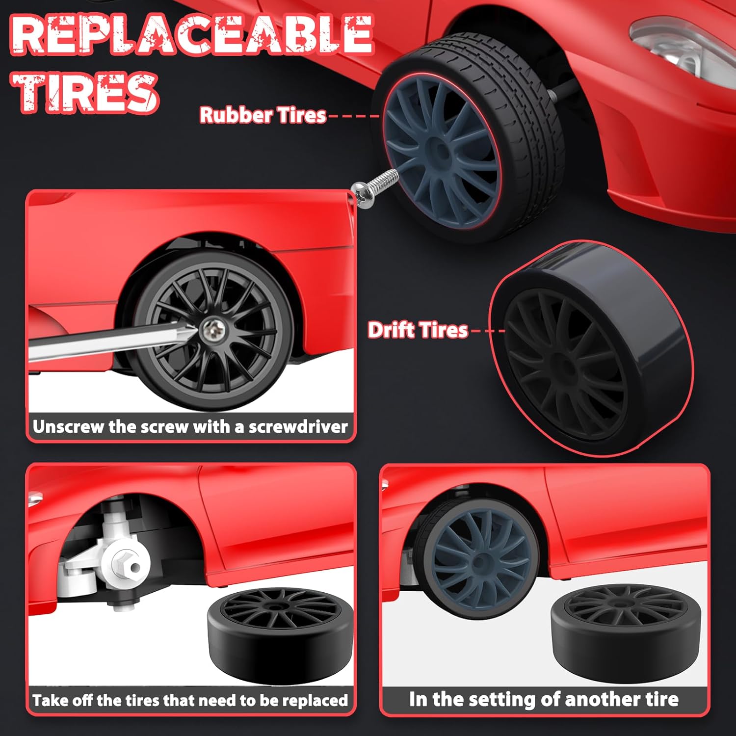 - Multi Function Toy: The RC cars is equipped with two types of tires, racing tires and drifting tires, which allows you to feel the different fun of racing and drifting. The two tires can easily switch to adapt to various scenes
