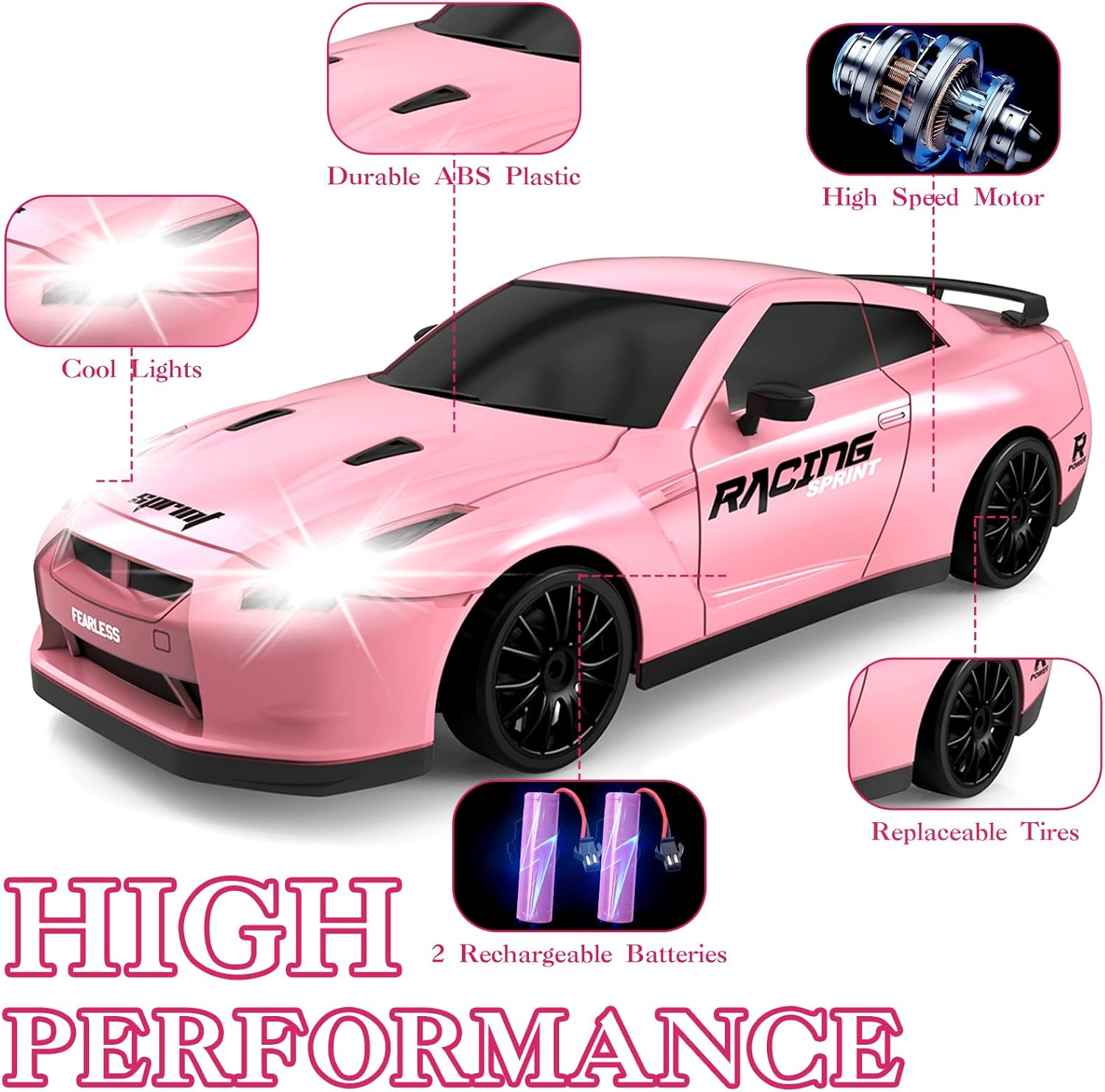 - ABS Material: Pink dift RC cars body is made up of high quality safety material ABS, which is safe, non-toxic, durable and sturdy for kids to play. It can effectively resist the breakage caused by the collision and provide children with safe racing scenes