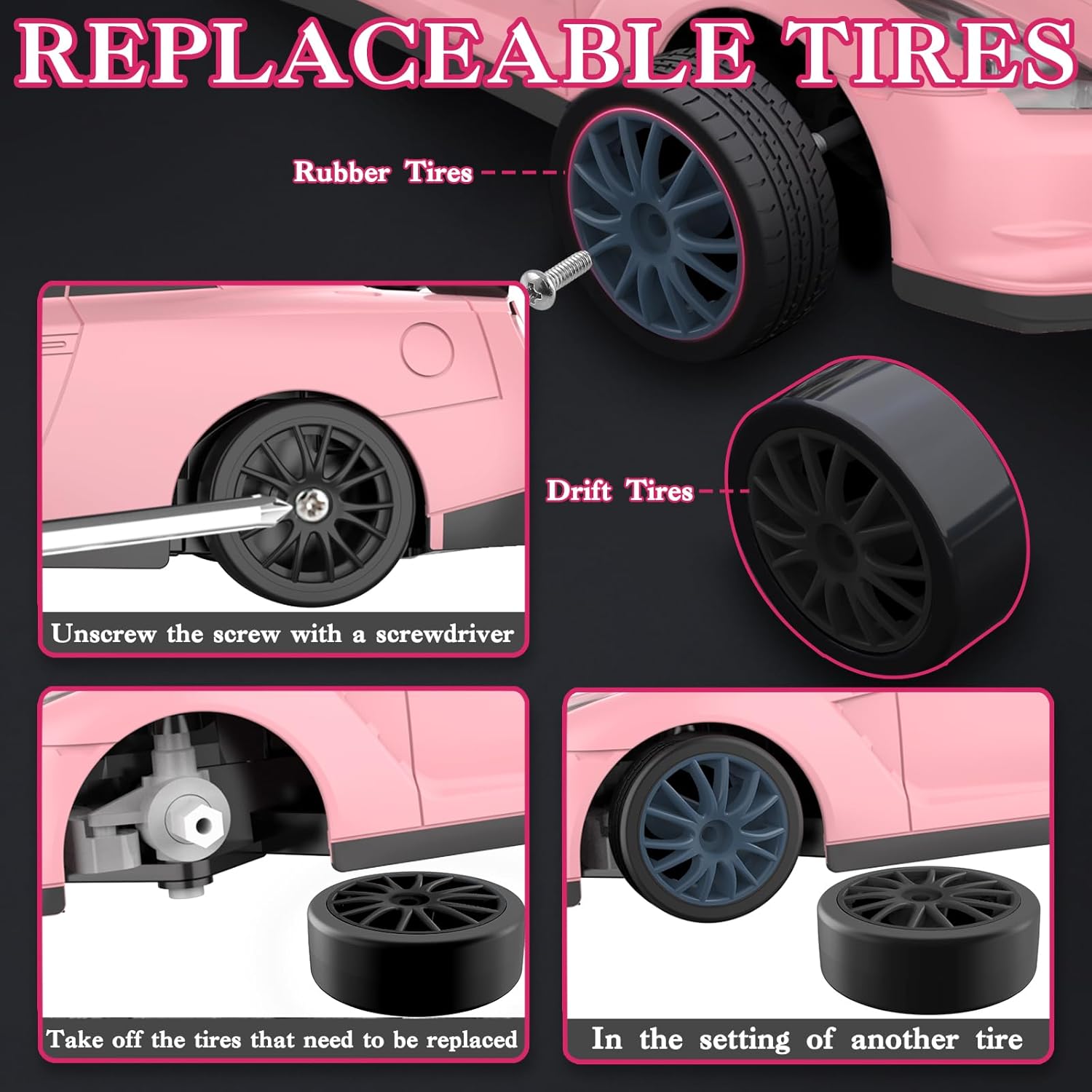 - Multi Function Toy: RC pink drift cars for girls is equipped with two types of tires, racing tires and drifting tires, which allows you to feel the different fun of racing and drifting. The two tires can easily switch to adapt to various scenes