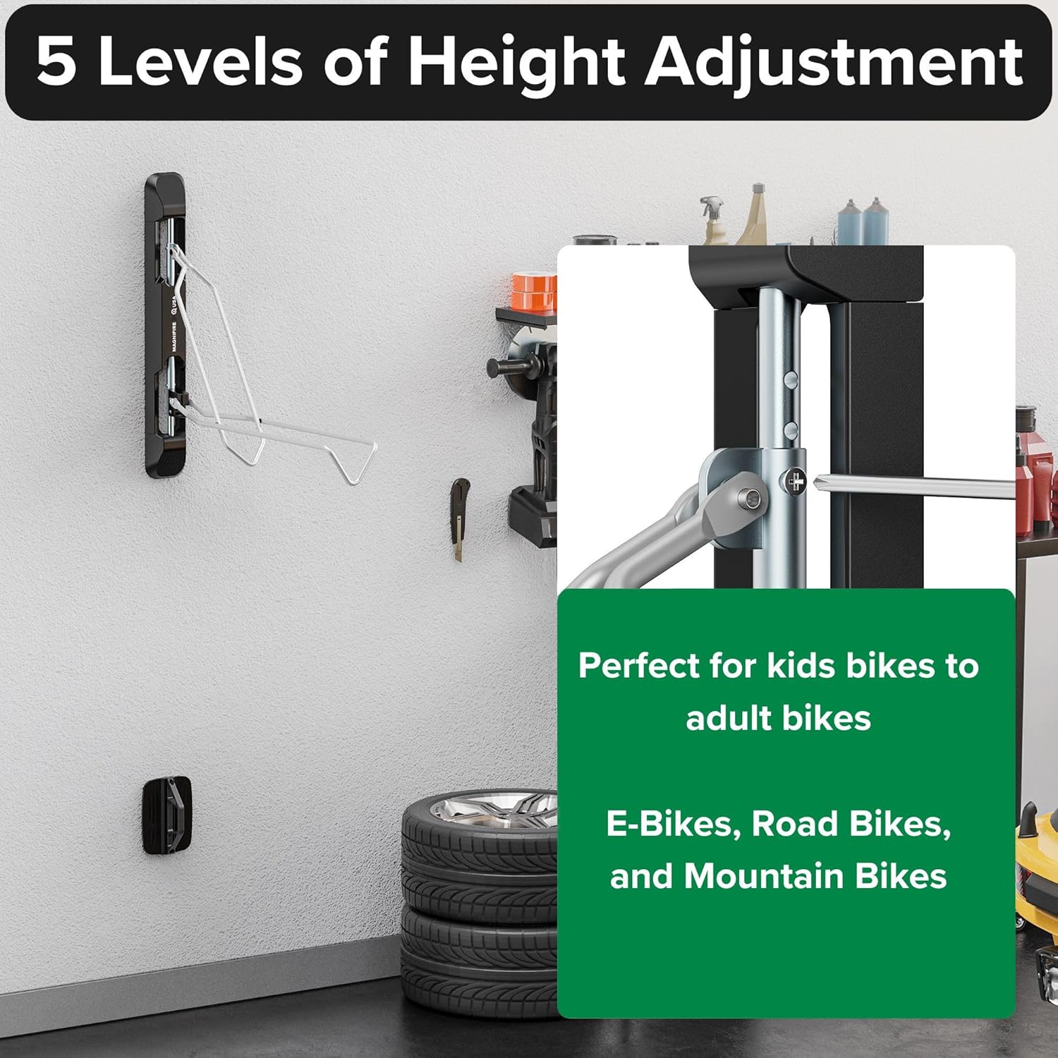 Bicycle Rack for Garage and Indoor Use, Adjustable, Foldable Bike Rack Set of 2 - Wall Mount for Road, Hybrid, Small Mountain, BMX Bikes - Secure and Space Saving Bike Storage (2 Pack)