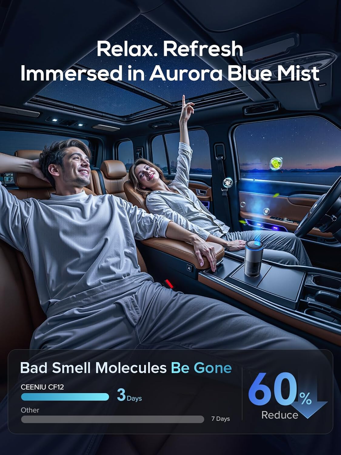- [2025 Flagship Model: Upgraded Fountain Mist Nozzle] Enjoy a premium fountain spray and stylish blue lighting with the Ceeniu CF12 Smart Car Air Freshener! Experience luxury and long-lasting freshness—all in one charge. Just go with it!