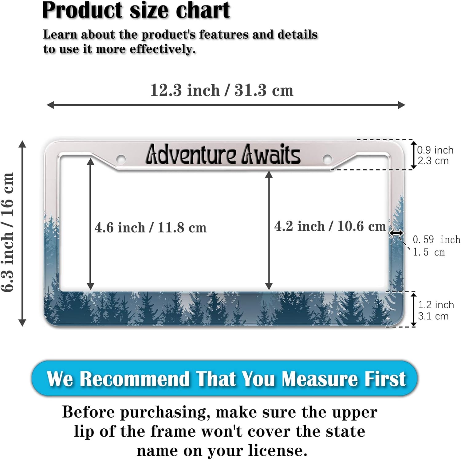 - STANDARD FRAME SIZE: Ensure a perfect fit by checking the dimensions to avoid covering your state name. These frames are specifically designed to fit standard American license plates measuring approximately 12.3" x 6.3" (16 x 31 cm). for most license plates in the U.S.