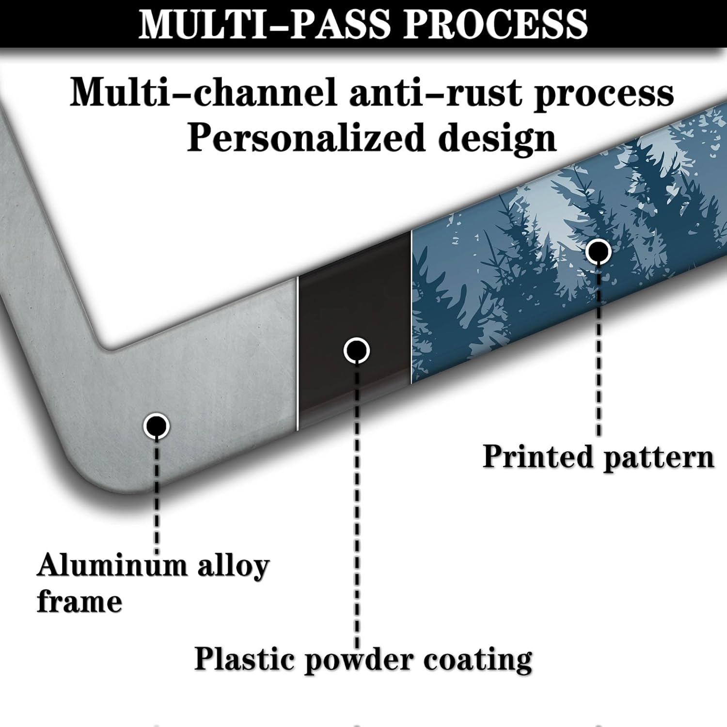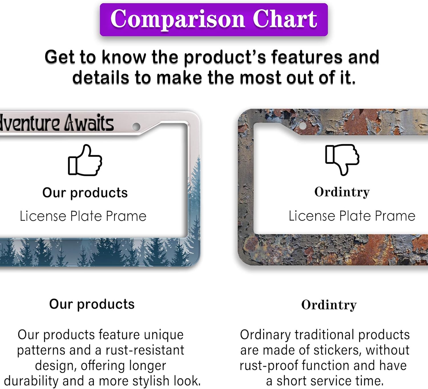 - ALUMINUM FRAME: This License Plate Frame is crafted from high-quality aluminum that is resistant to corrosion, rust, and harsh weather conditions. Its rugged reliability design ensures a long lifespan, making it capable of withstanding car washes and extreme weather, providing you with a reliable and stylish solution for your vehicle.