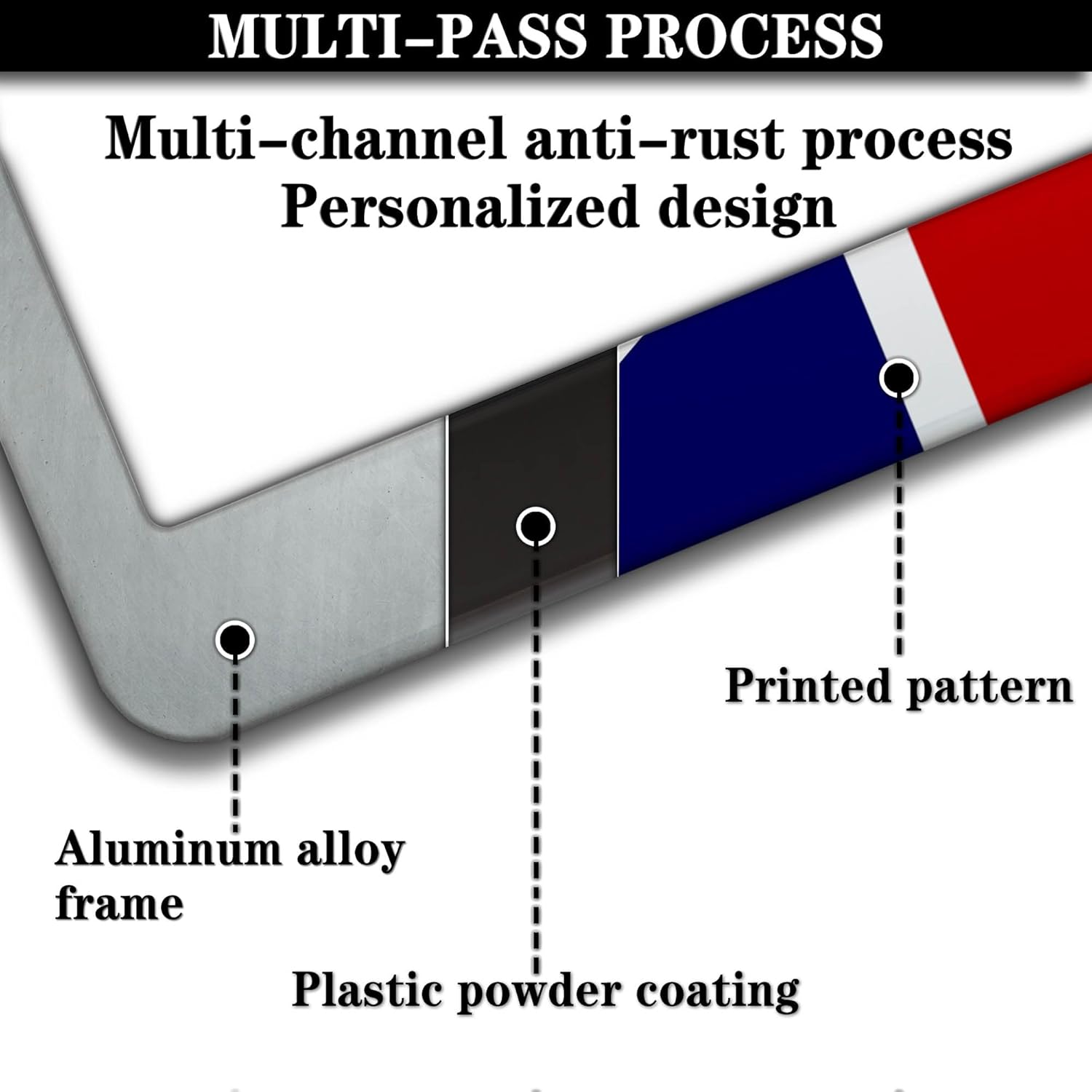 - ALUMINUM FRAME: This License Plate Frame is crafted from high-quality aluminum that is resistant to corrosion, rust, and harsh weather conditions. Its rugged reliability design ensures a long lifespan, making it capable of withstanding car washes and extreme weather, providing you with a reliable and stylish solution for your vehicle.