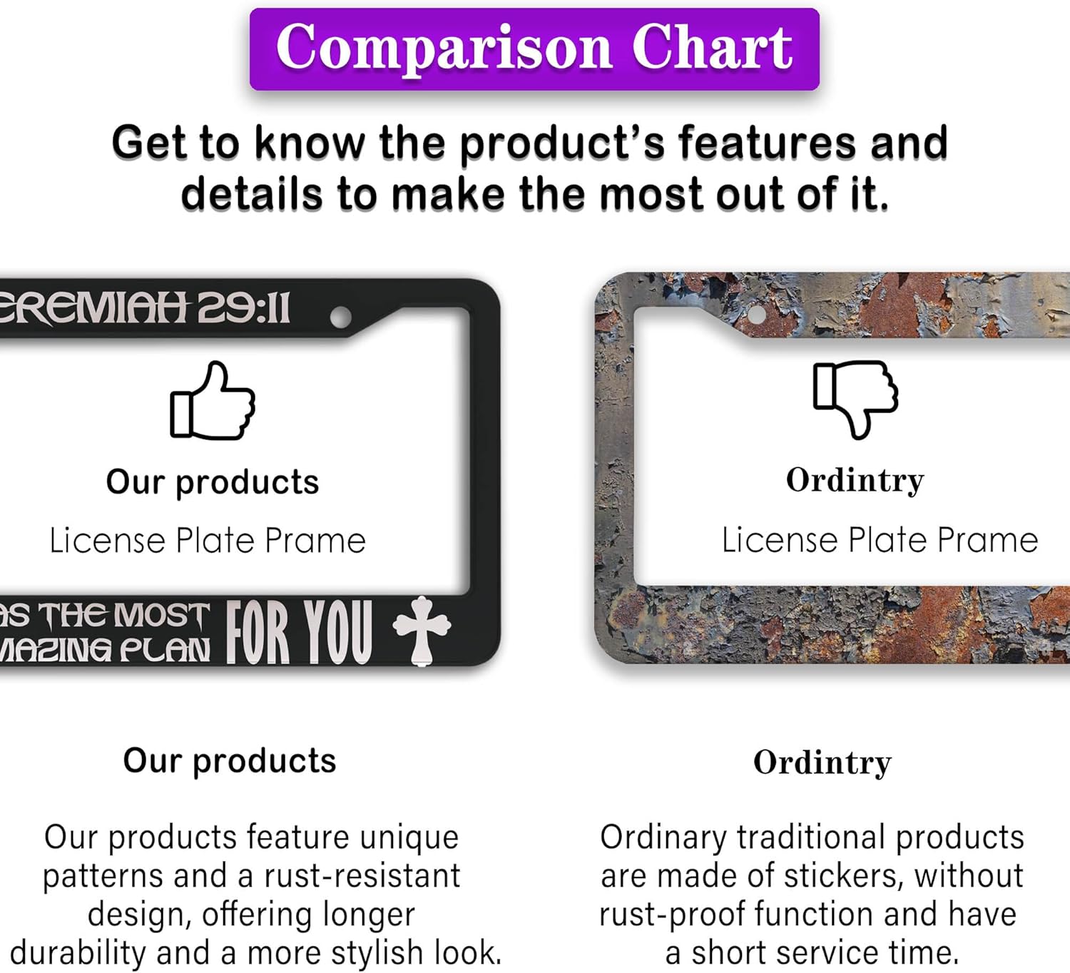 - ALUMINUM FRAME: This License Plate Frame is crafted from high-quality aluminum that is resistant to corrosion, rust, and harsh weather conditions. Its rugged reliability design ensures a long lifespan, making it capable of withstanding car washes and extreme weather, providing you with a reliable and stylish solution for your vehicle.