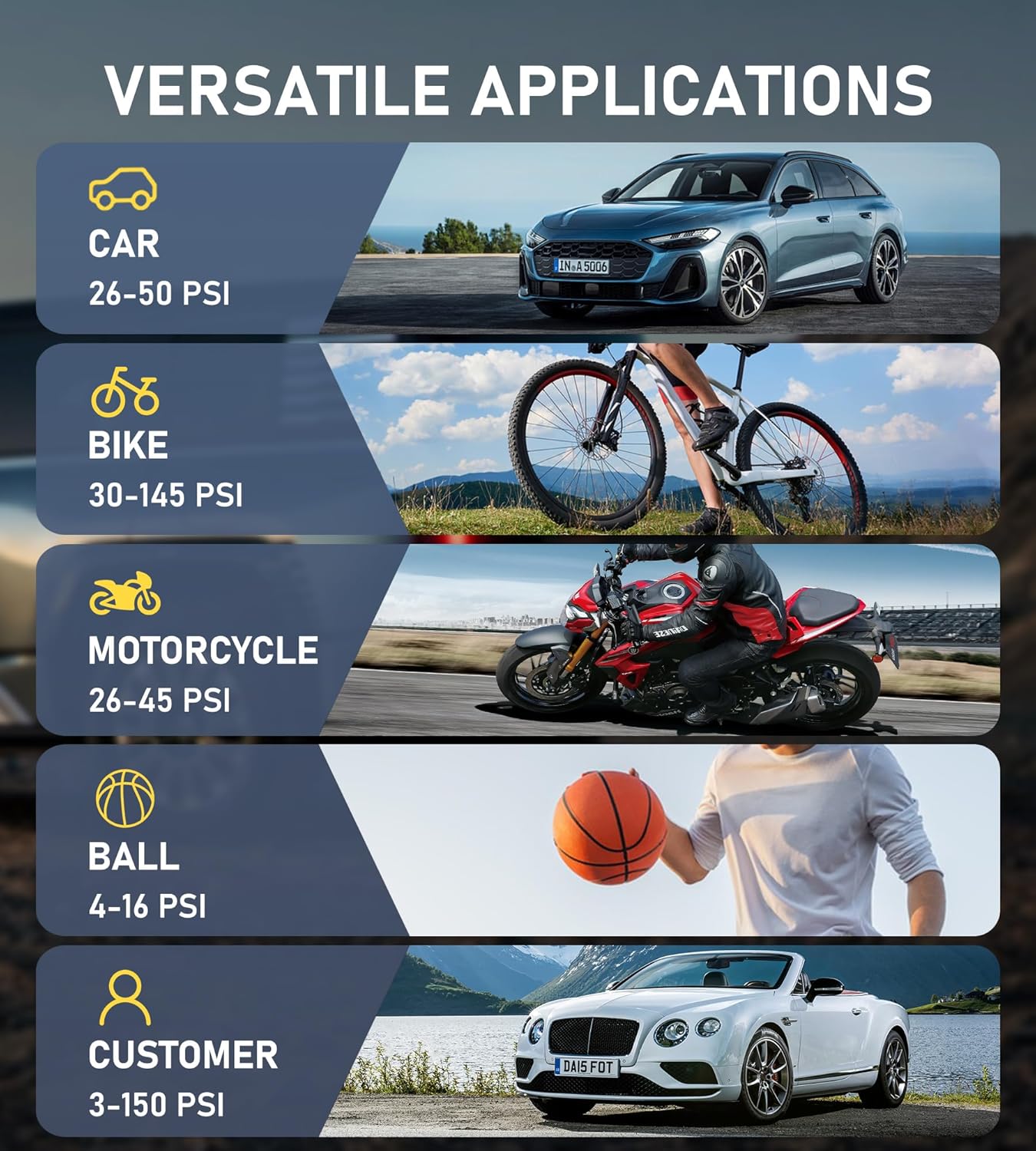 - 5 Inflation Modes: Our tire inflator offers you 5 preset inflation modes (Car, Motorcycle, Bike, Ball, and Custom Mode), with 4 pressure unit options - PSI, KPA, BAR, KG/CM. This portable air pumpenhances your convenience and flexibility, making it the perfect companion for all your inflatable needs