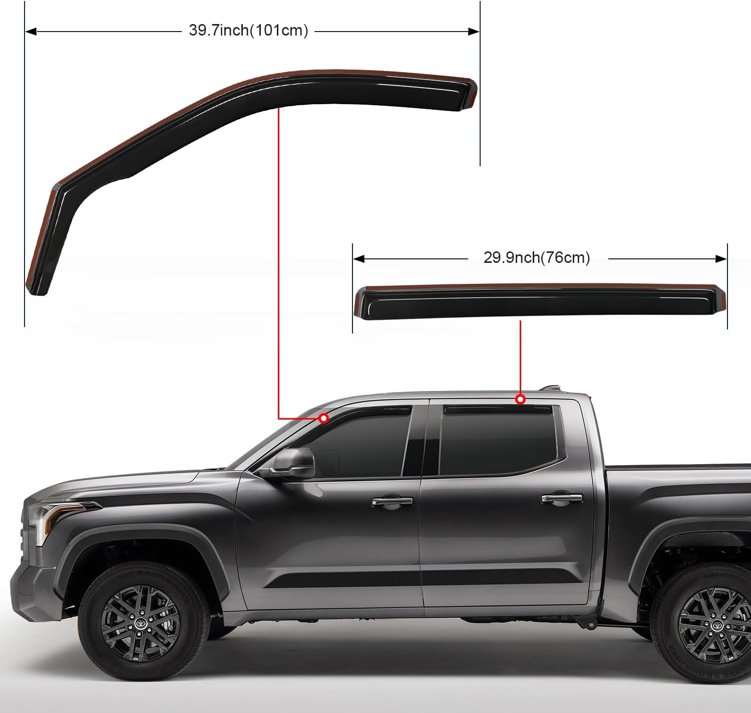 - PACKAGE INCLUDED:4 PCS Rain Guards,12pcs clips,Crowbar 1pcs,78inch double-sided tape and installation instruction