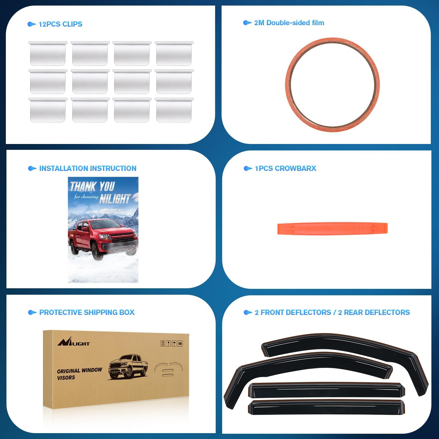 - PACKAGE INCLUDED:4 PCS Rain Guards,12pcs clips,Crowbar 1pcs,78inch double-sided tape and installation instruction