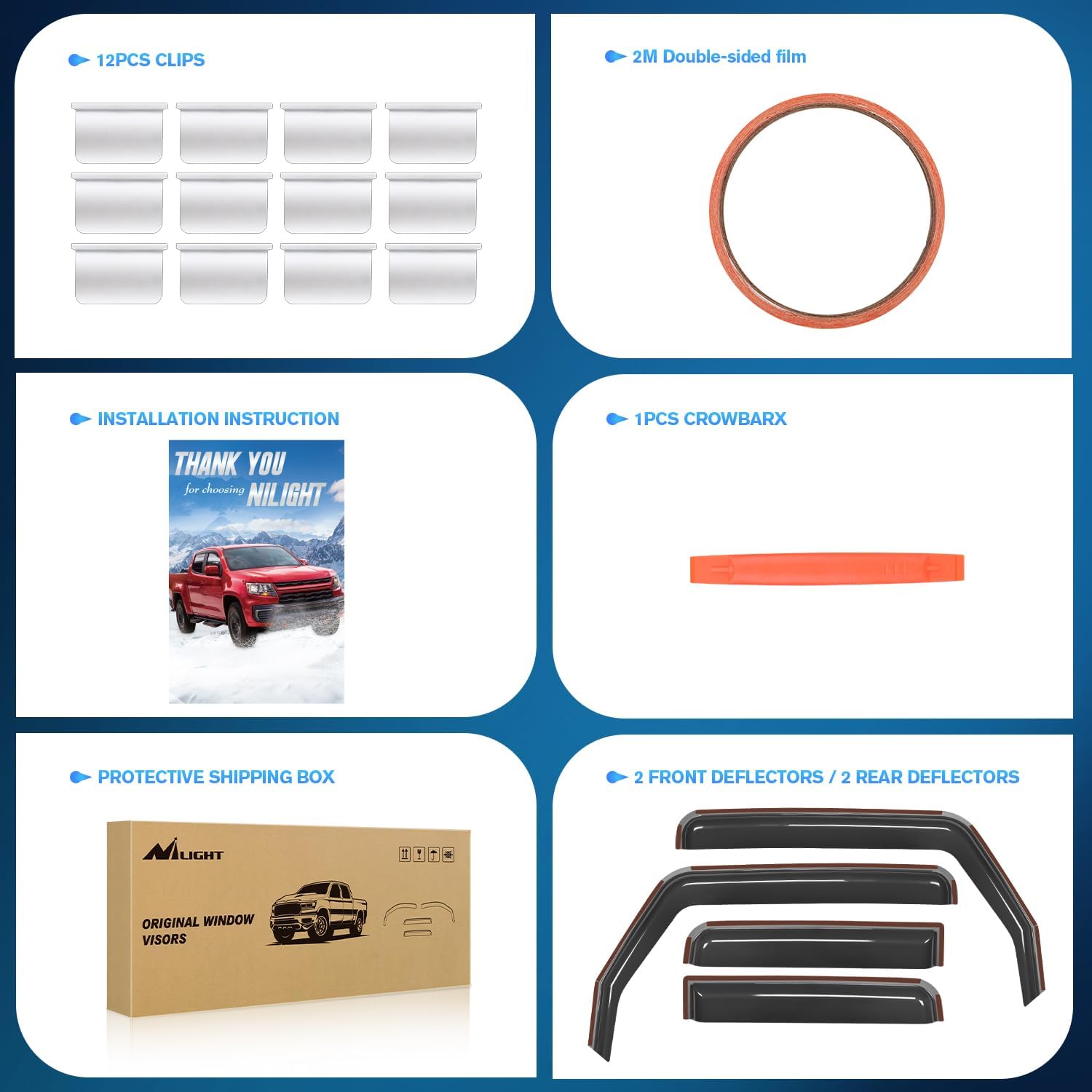 - Advantage:Nilight window deflectors are great for all weather conditions,help improve ventilation inside and outside your car to reduce mirror and window fogging while increasing air circulation。With our side window deflectors, it deflects the rain and noise away from your windows to make your driving more enjoyable