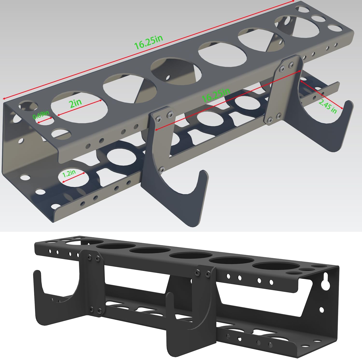 - [Suitable for] This Wall Mounted Caulk Tools Rack can hold 1 caulking gun, 6 caulking tubes and more caulking nozzle, besides, there's several small holes on the ends you can place objects like screwdrivers or nails for sealing caulking tube's. The size of caulking gun and caulking tube holder is16.3 x 6.1 x 3.4 inches.