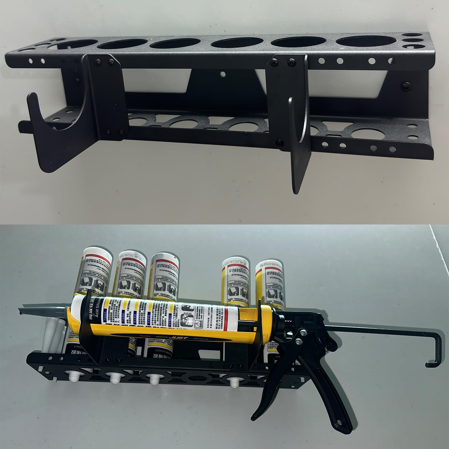 - [High quality] Our Caulking Gun Holder Caulking Gun Storage Rack is made from high quality metal, with a rust resistant coating, so this Wall Mounted Caulk Tools Rack can be using for a long time.