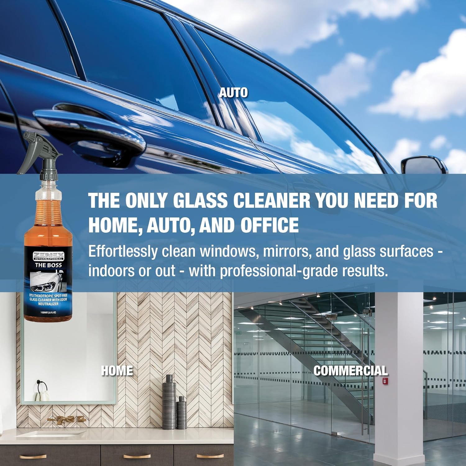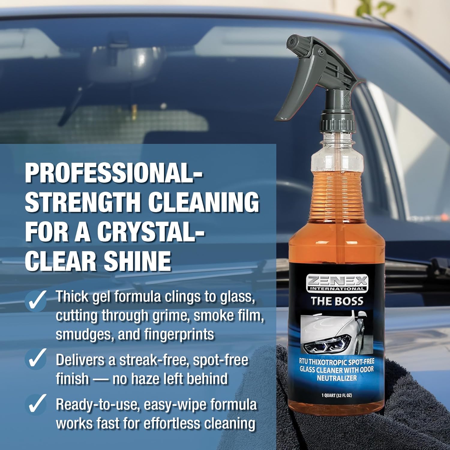 - PROFESSIONAL-GRADE GLASS CLEANER: Zenex The Boss Glass Cleaner is engineered for detailers, auto professionals, and enthusiasts who demand a powerful cleaning solution. It eliminates tough dirt, films, fingerprints, lipstick, bugs, and stubborn grime, leaving behind a crystal-clear, streak-free shine. This ready-to-use (RTU) cleaner delivers professional results every time. (Note: Not for use on tinted glass.)