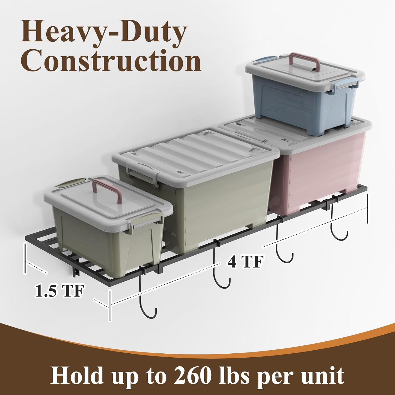 - 🔧Save Space & Superb Strength: The large wall-mounted shelves optimizes your garage space, perfect for storing various items like storage bins, boxes, tires, sporting goods, and more. Constructed from alloy steel square tubing frame, each shelf can support up to 260 lbs.