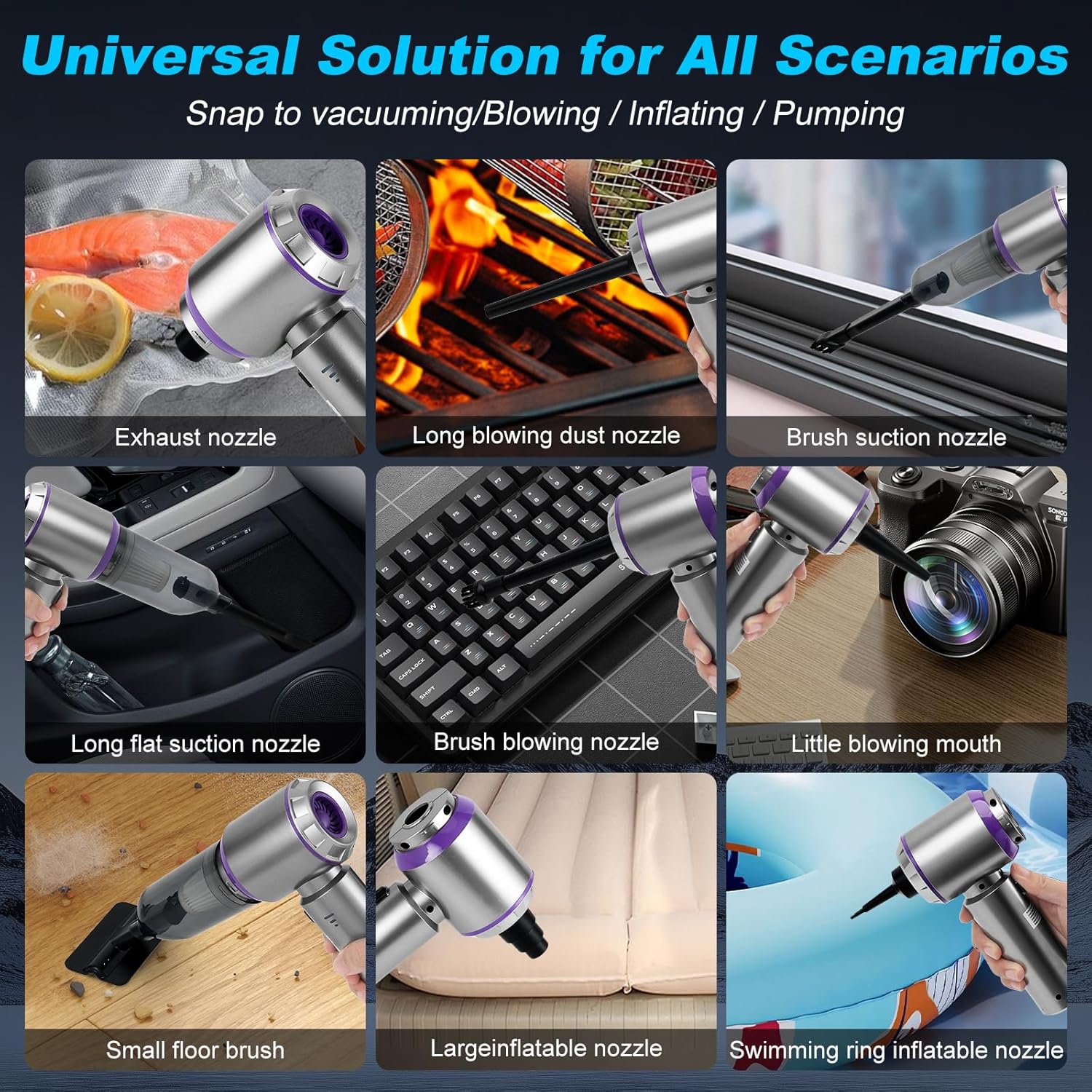 - 【Rich multifunctional accessories】Our handheld vacuum provides a variety of accessories to meet all your needs, such as long nozzles, brushes and long nozzles, which can easily clean all kinds of dust and garbage. Blower nozzle provides strong airflow, which can quickly dry wet clothes or hair. Suction nozzles can suction and inflate organizers to make organizing easier. Pet care brush can suck away hair while brushing your pet. Inflatable nozzles can inflate balloons, swimming rings and so on